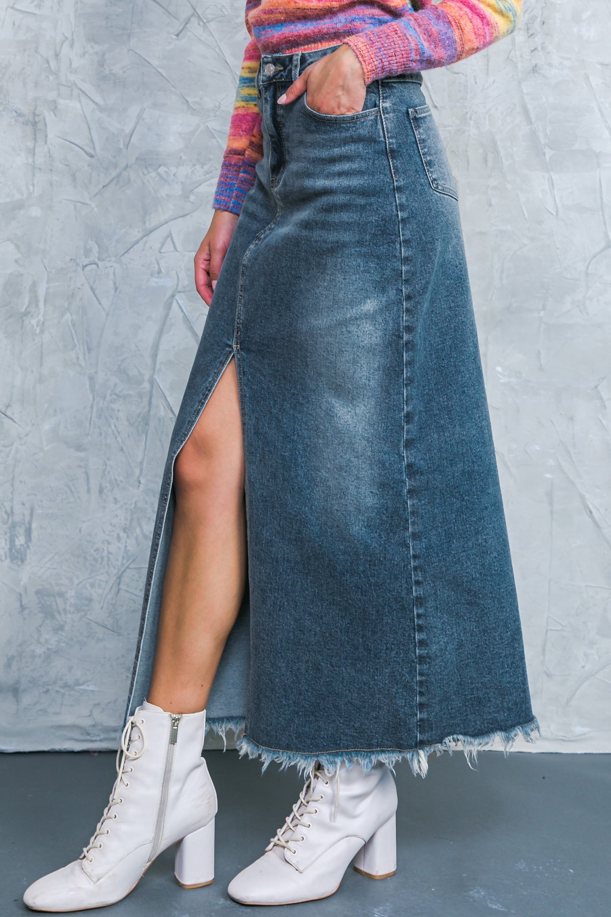 This Majestic Perfection Denim Skirt features all of the classic details of denim fashion. From the frayed bottom and side pockets to the high front slit and back pockets, you can enjoy the look and feel of a classic denim design. The front closure ensures the perfect fit for any style.