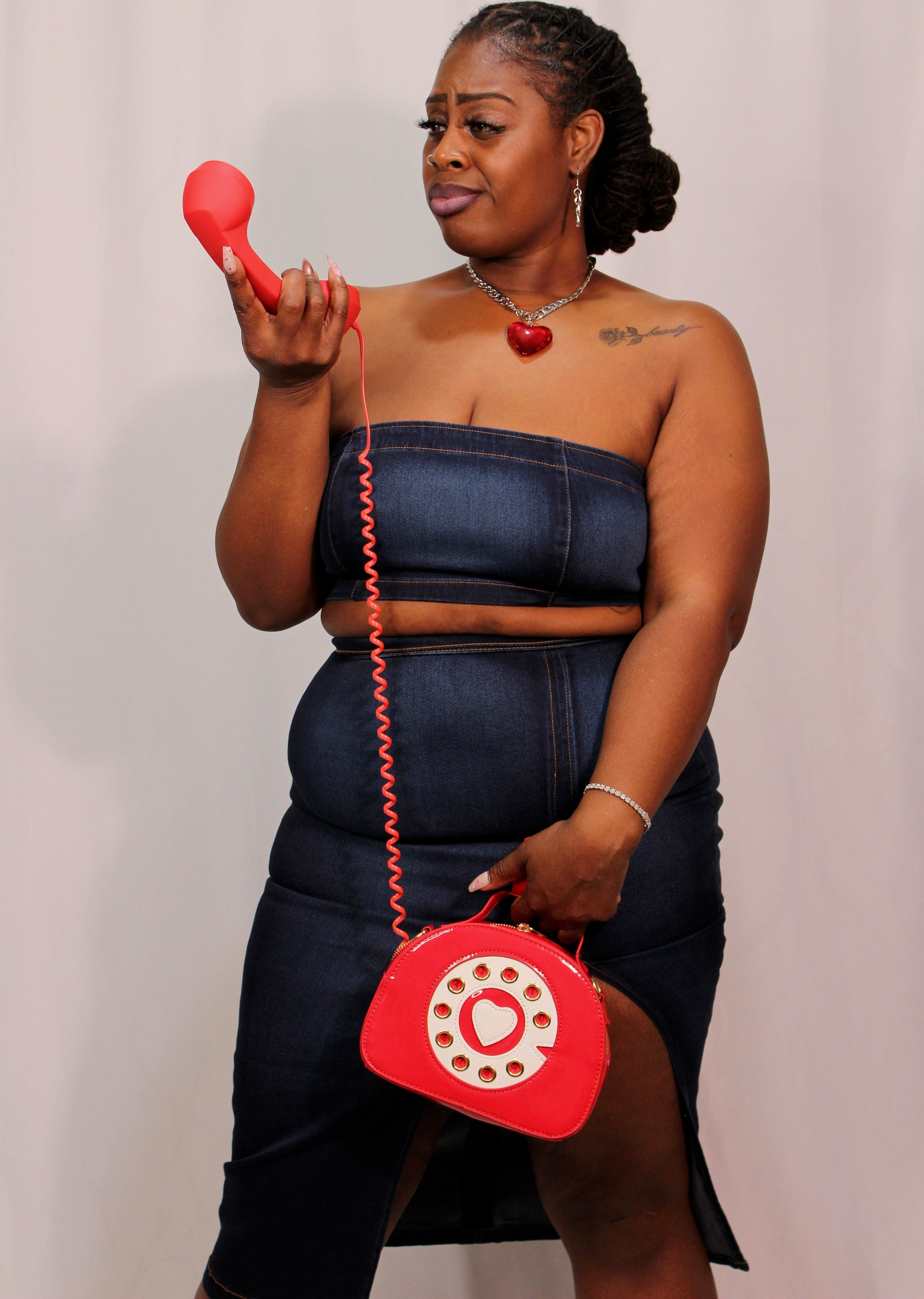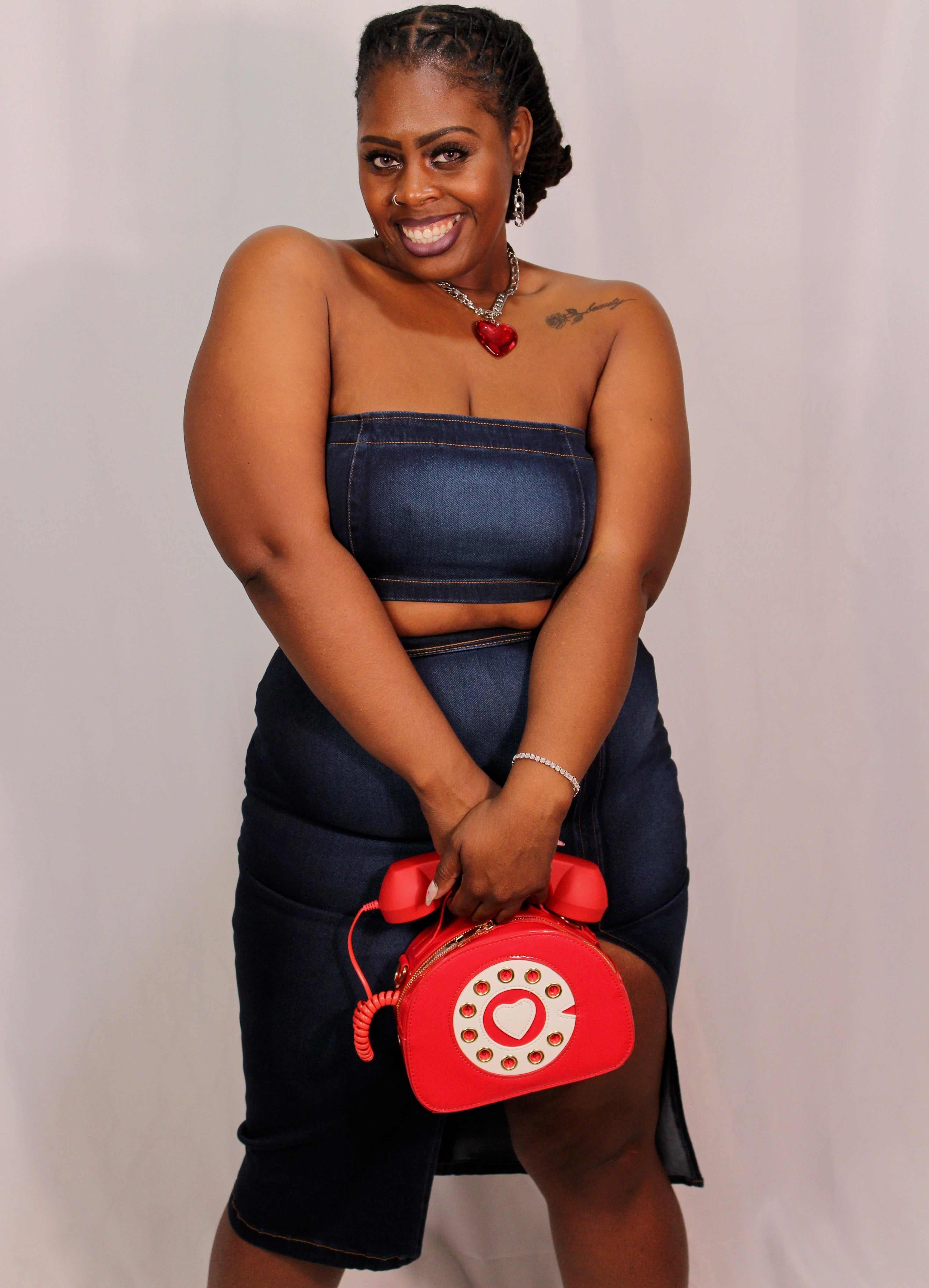 Denim Skirt set features pencil denim skirt with front slit and back button and zipper closure. Denim Top features back zipper closure, Stretch Denim