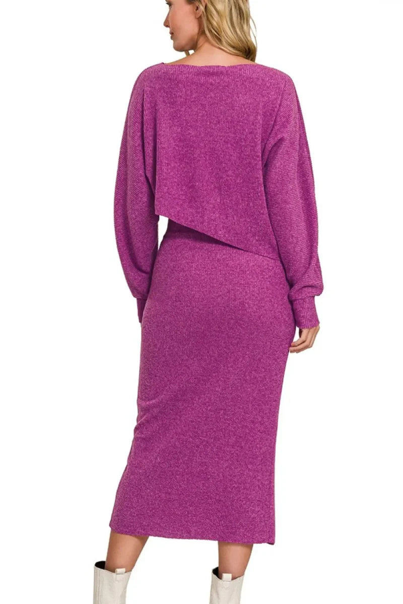 Zenana Ribbed Asymmetric Hem and Sleeve Top & Skirt Set ‐ LT PLUM / S