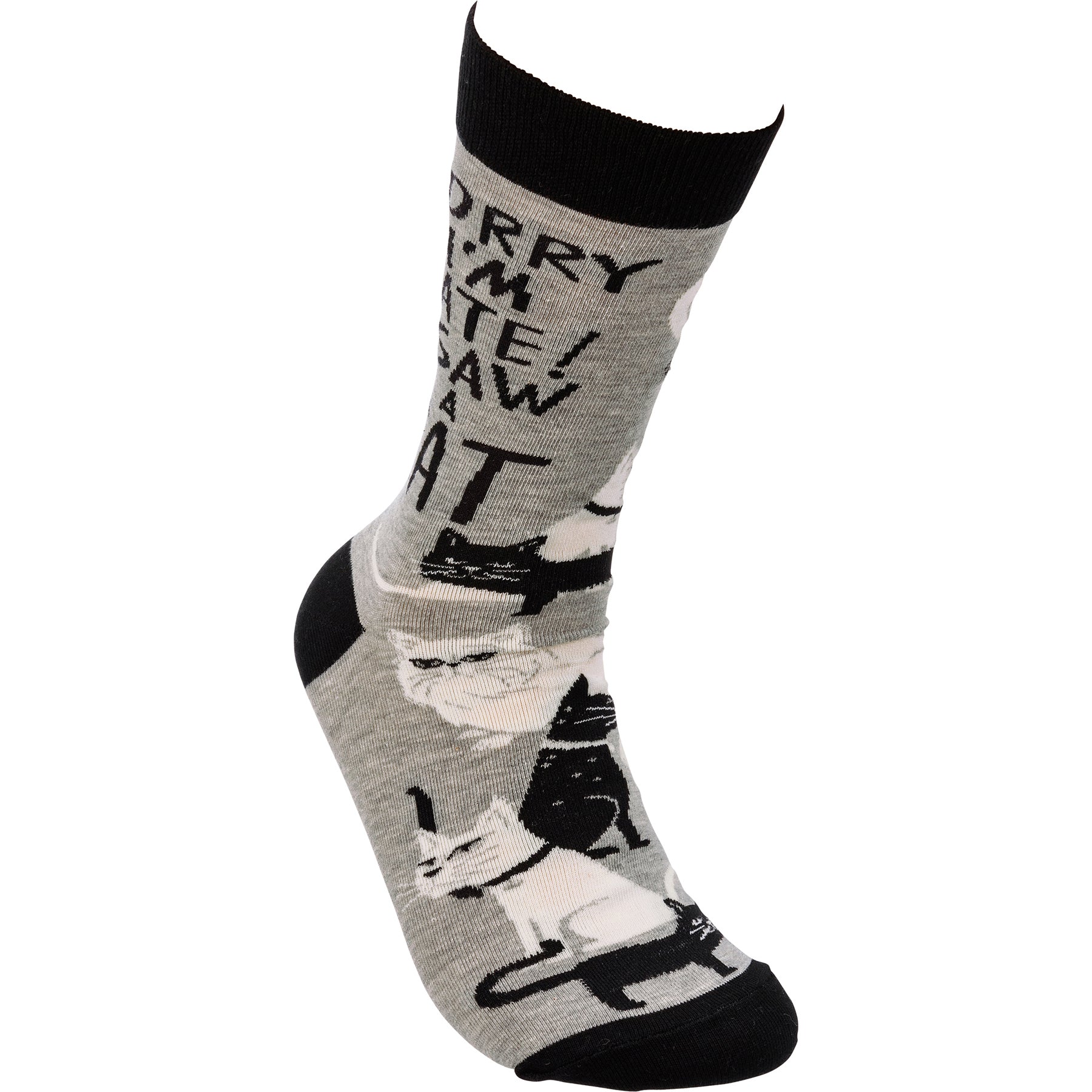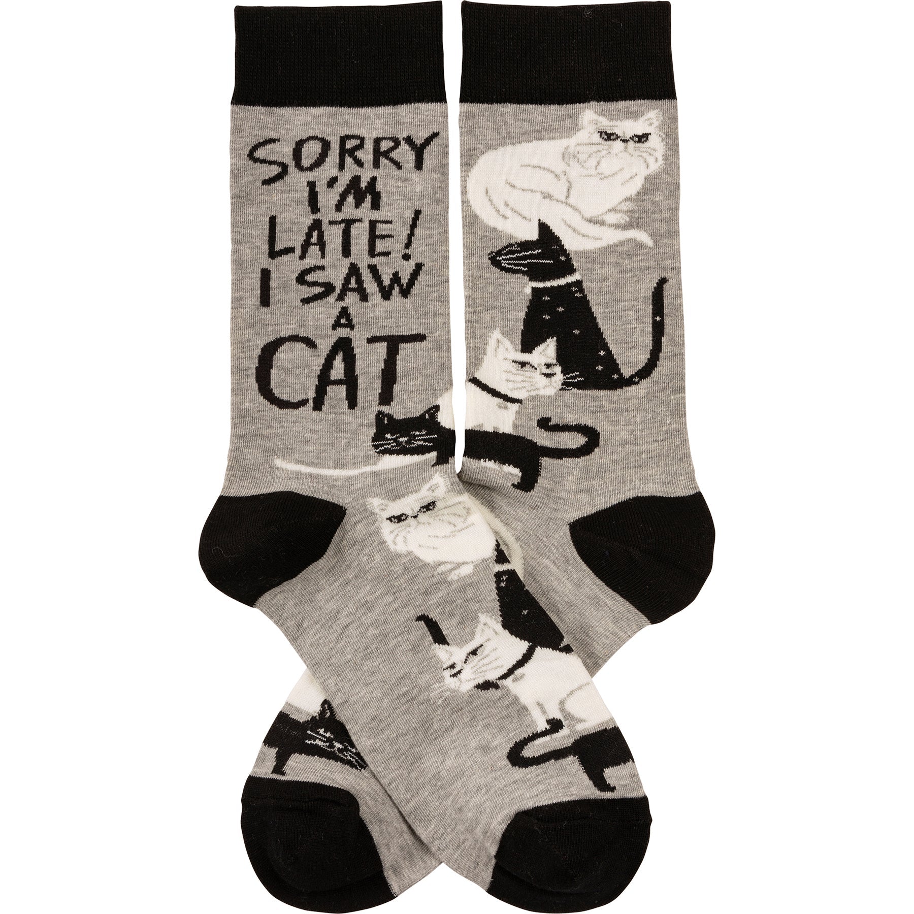 These colorful socks feature woven designs with coordinating "Sorry I'm Late! I Saw A Cat" sentiment.