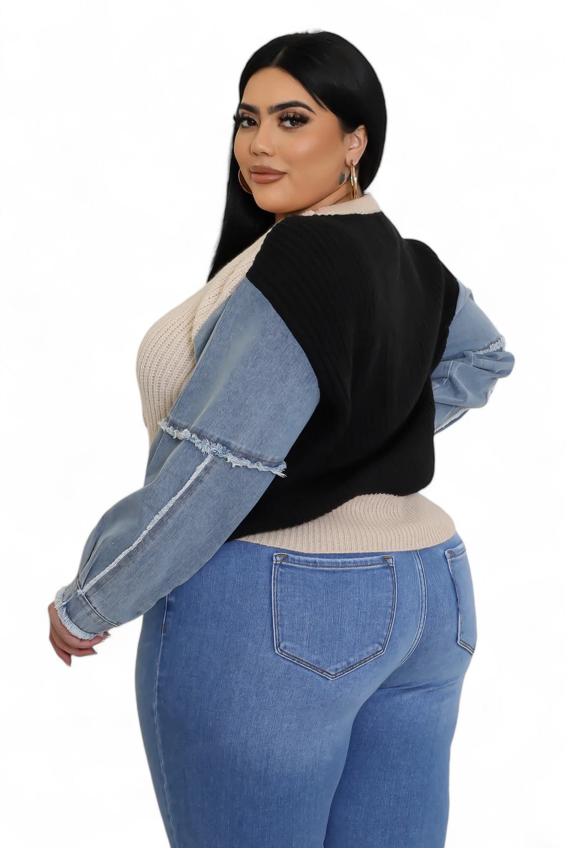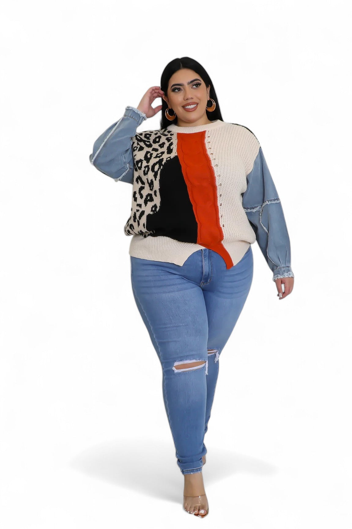 Curvy Leopard/Ivory/Rust/Black Denim Sleeve Sweater Top