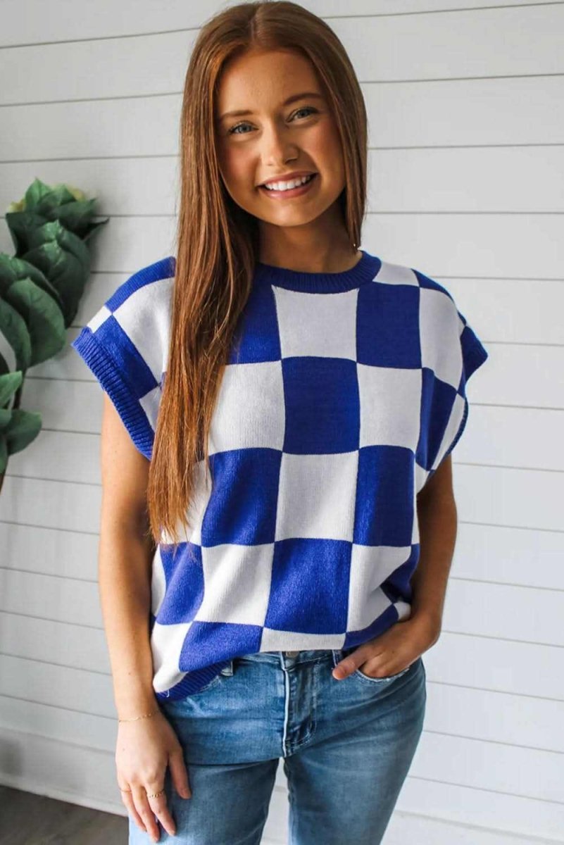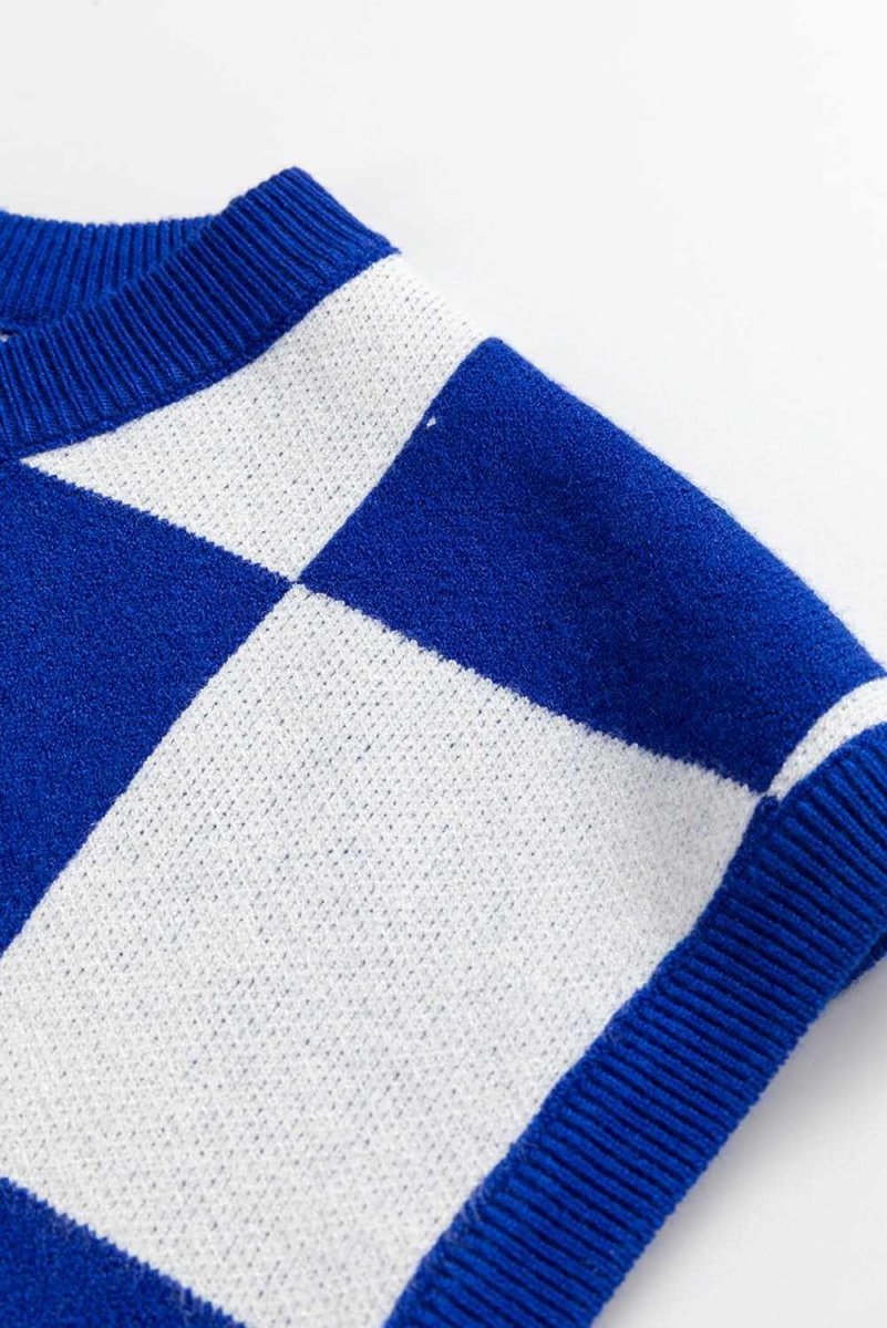 Dark Blue Cherckerboard Round Neck Sweater Vest ‐ Dark Blue / L / 50%Viscose+28%Polyester+22%Polyamide