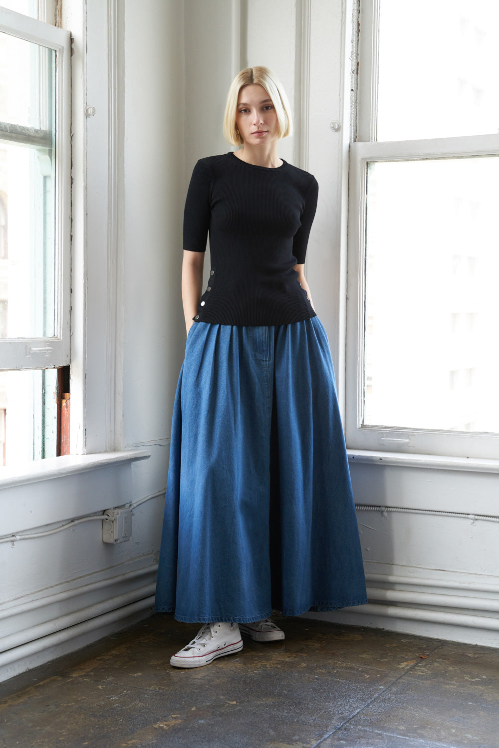 A knitted ribbed sweater top featuring round neckline, muscle sleeve and bottom side snap detail