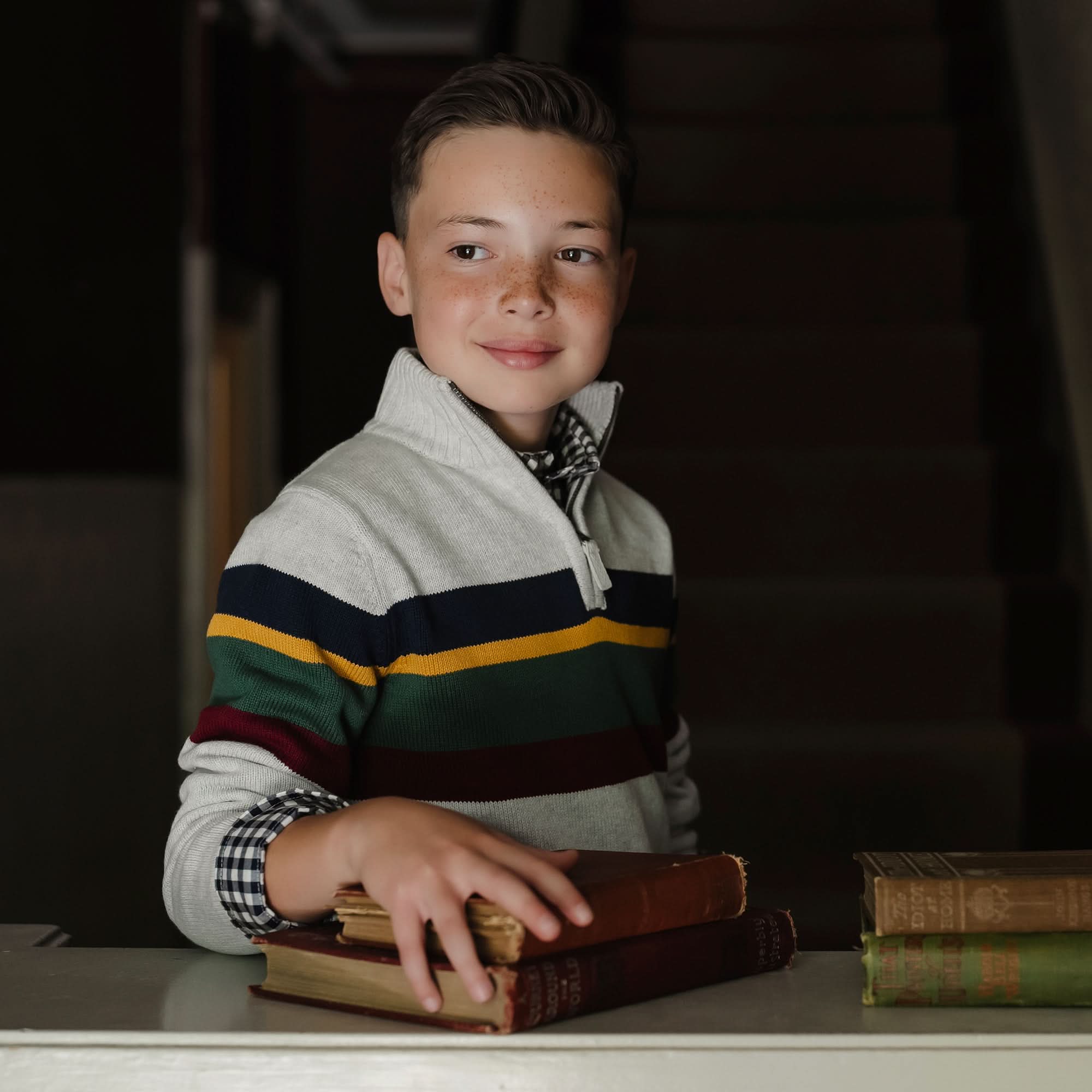 Organic Half Zip Sweater ‐ S (5/6) / Light Gray Heather with Homeroom Stripe