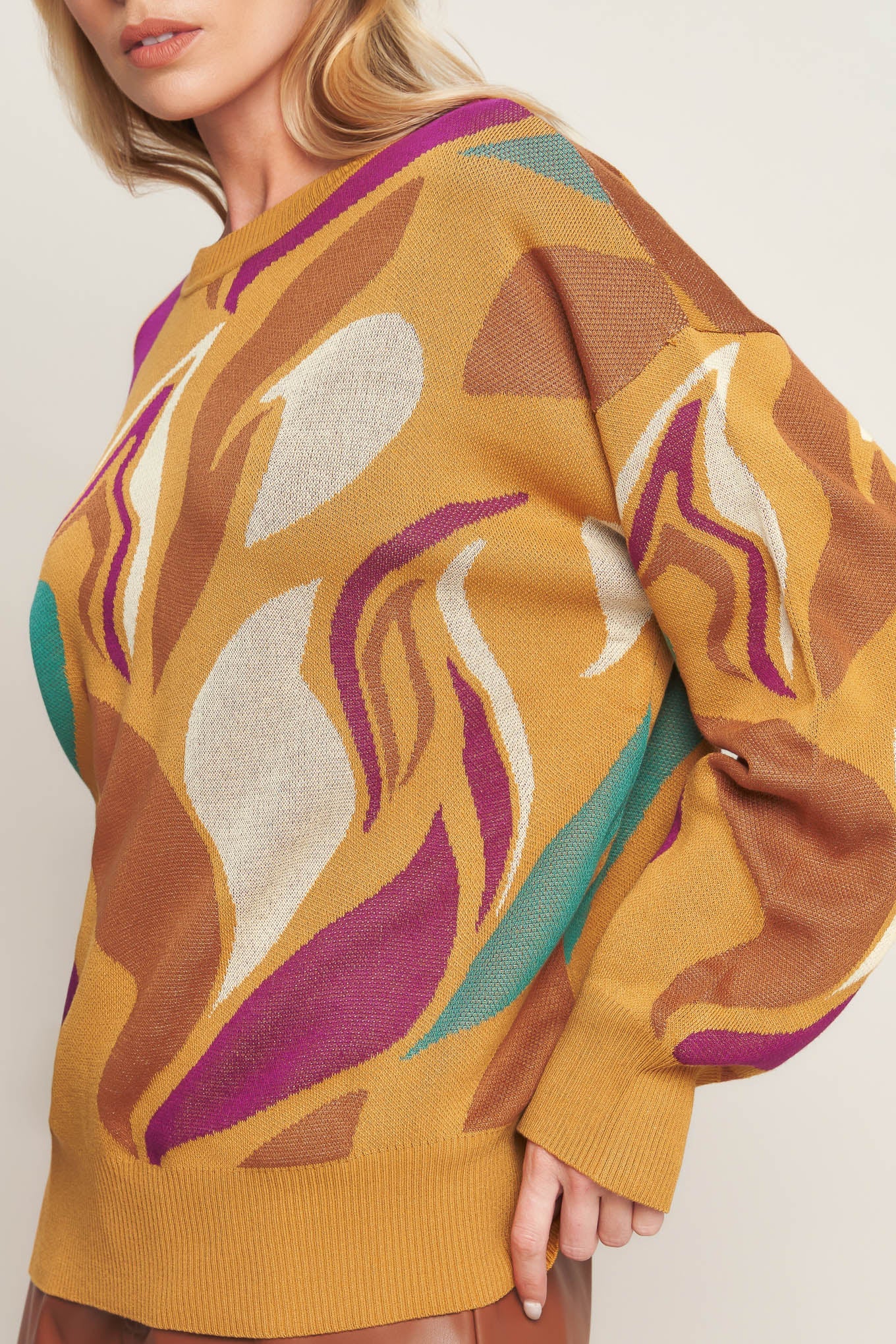 This READY TO ADORE SWEATER TOP is the perfect combination of comfort and style. It features a classic jacquard graphic and a bold crew neck that's ideal for any look. The drop shoulder and long sleeve provide a comfortable fit, making it perfect for casual occasions.