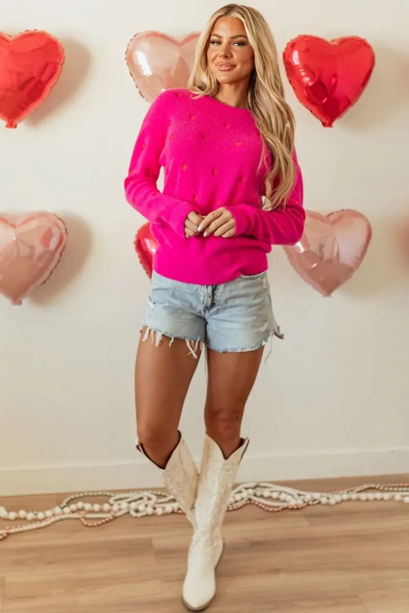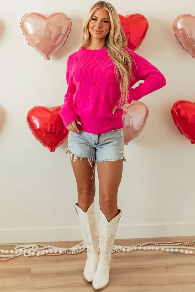 This rose red heart-shaped knit sweater blends comfort and romance for seasonal wear. The heart motifs are scattered across the fabric, providing a festive touch, while the drop-shoulder silhouette delivers a relaxed, contemporary fit. The round neckline and ribbed cuffs offer a clean, versatile silhouette that layers easily under a jacket or coat. Made from a soft knit blend, the sweater is suitable for holidays, casual outings, or everyday wear.