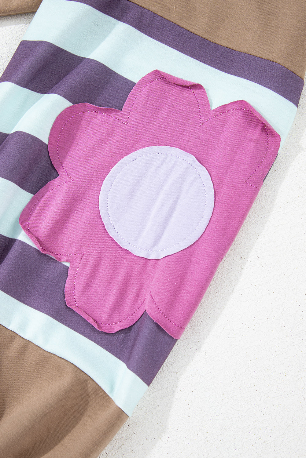 Light French Beige Flower Striped Patchwork Puff Sleeve Loose PLUS Sweatshirt