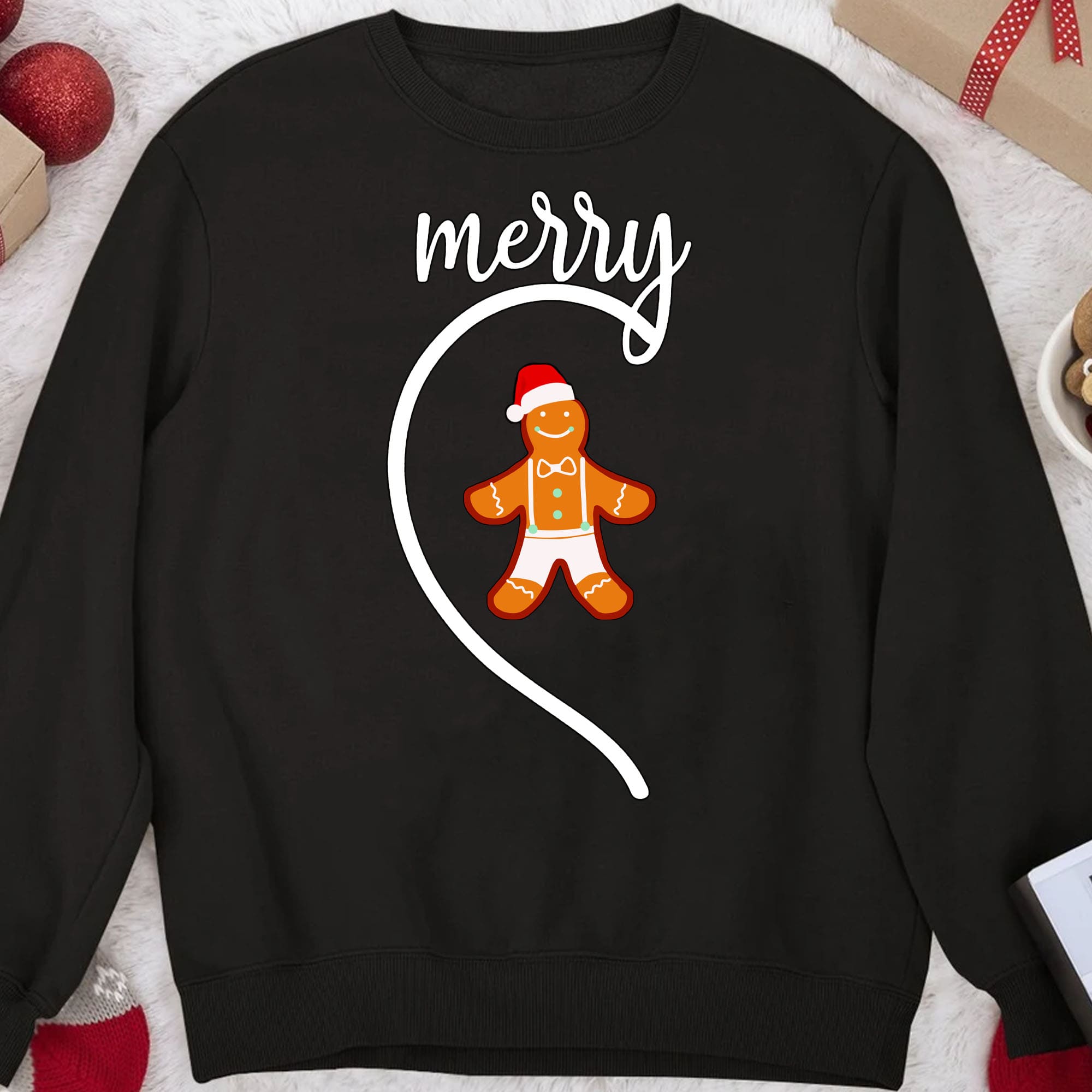 This is a set of matching couple shirts with a Christmas theme. The shirt on the left features the word "Christmas" in a stylish, cursive white font at the top. Below the text, there is a cute gingerbread man wearing a Santa hat, with a white line curving around him to add a festive touch. The gingerbread man is decorated with a bowtie and buttons. The shirt on the right mirrors the design, but with the word "merry" at the top, completing the phrase "Merry Christmas" when worn together. The gingerbread man and the decorative line on this shirt match the left shirt, creating a cohesive holiday look. The shirts white text and gingerbread man design pop, adding to the fun and festive holiday vibe.
