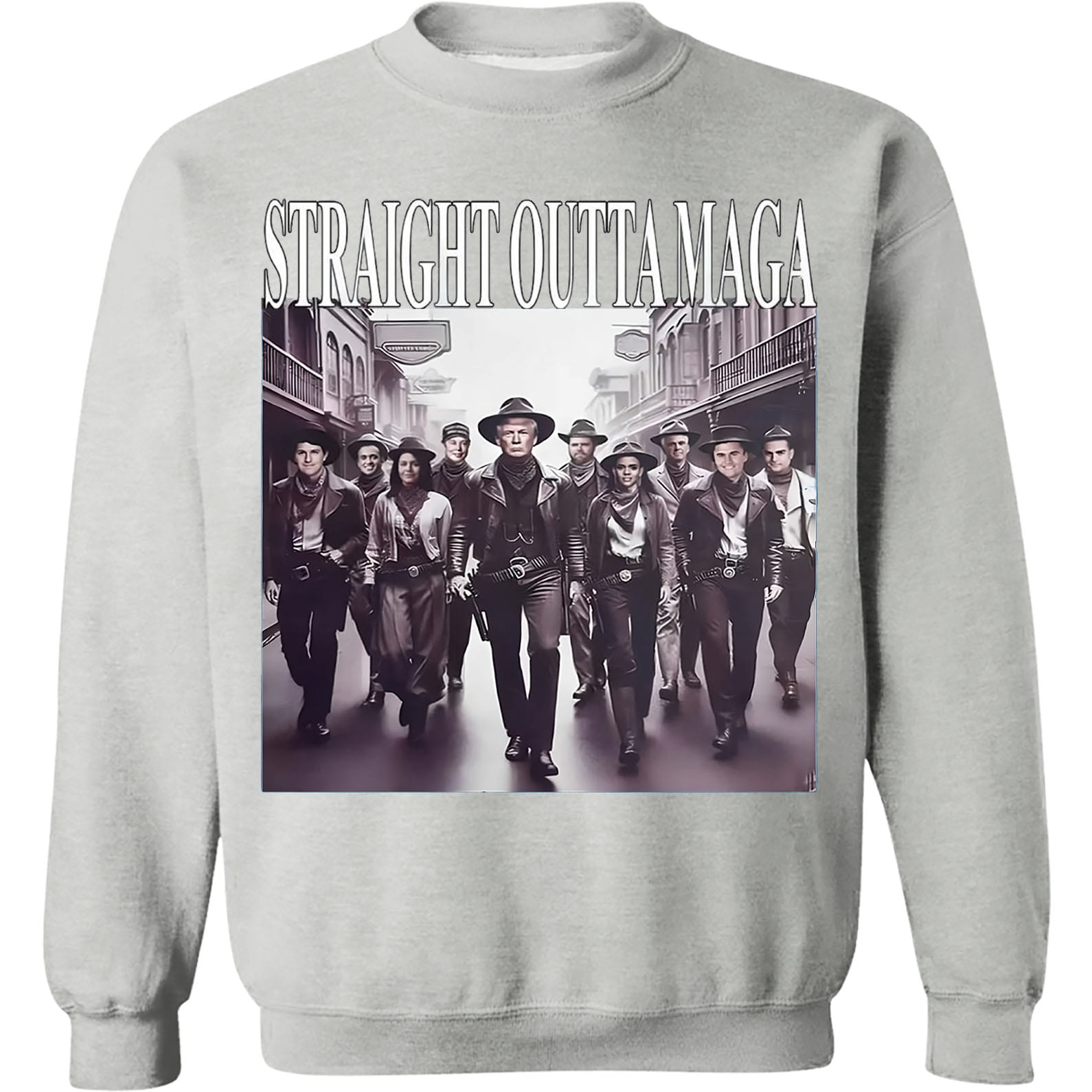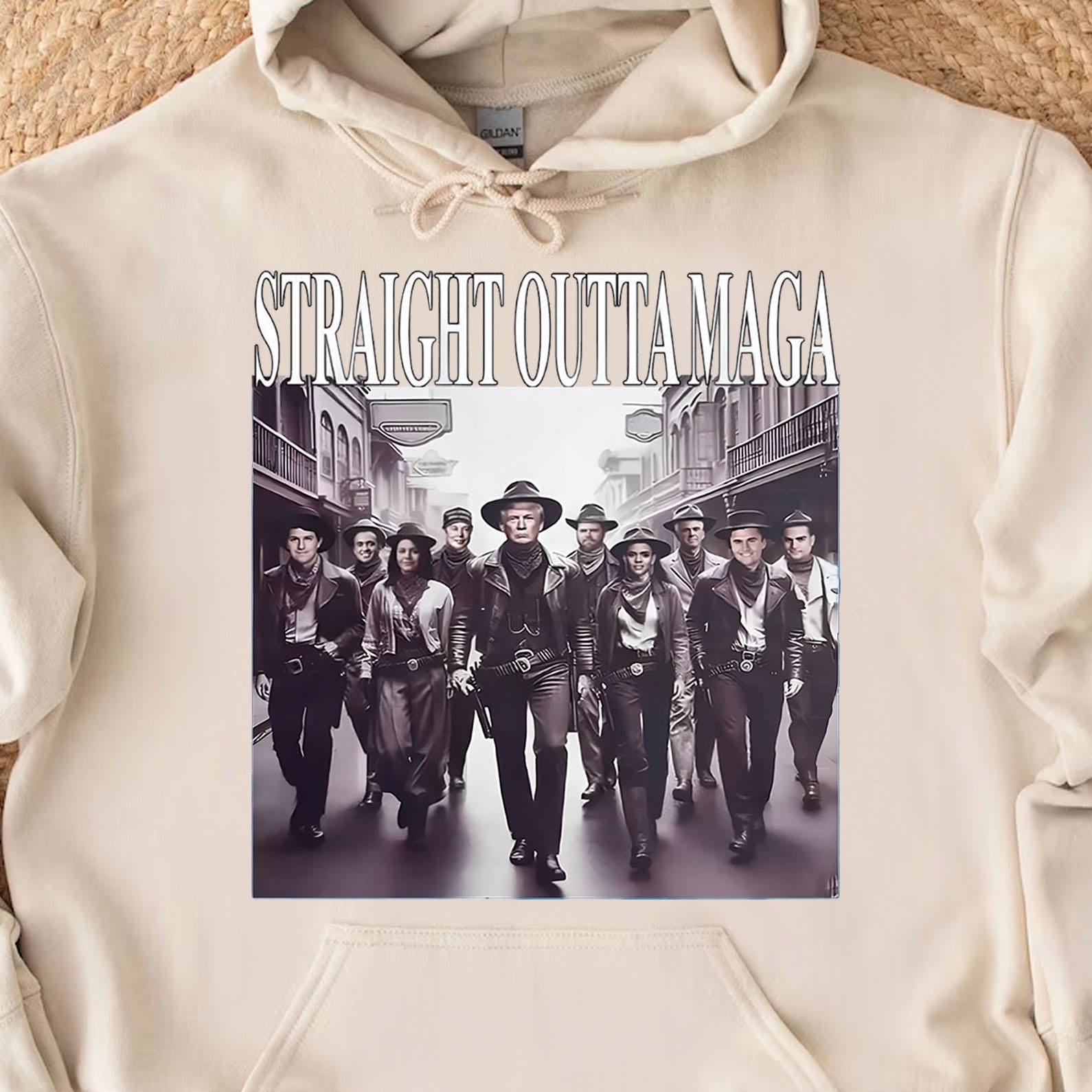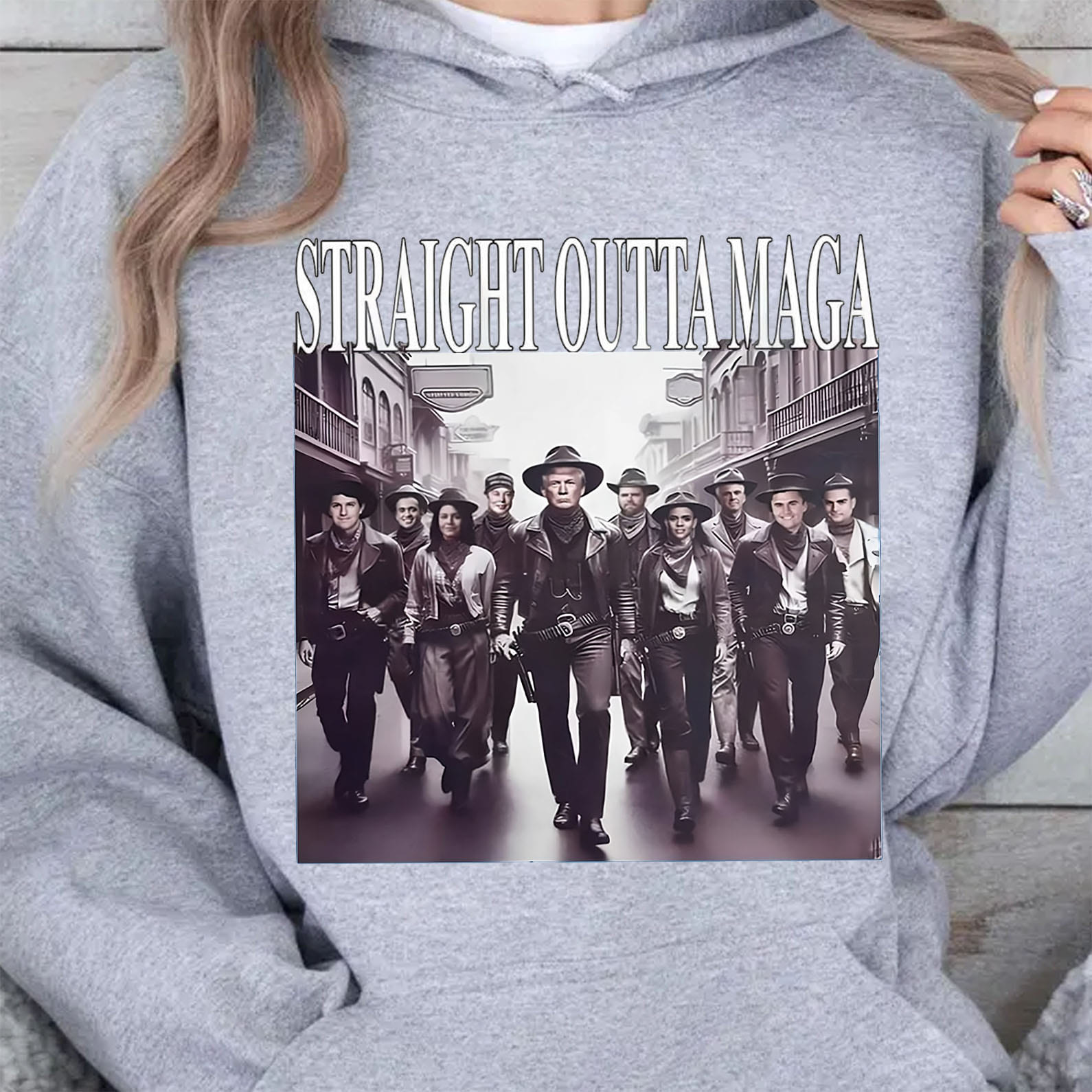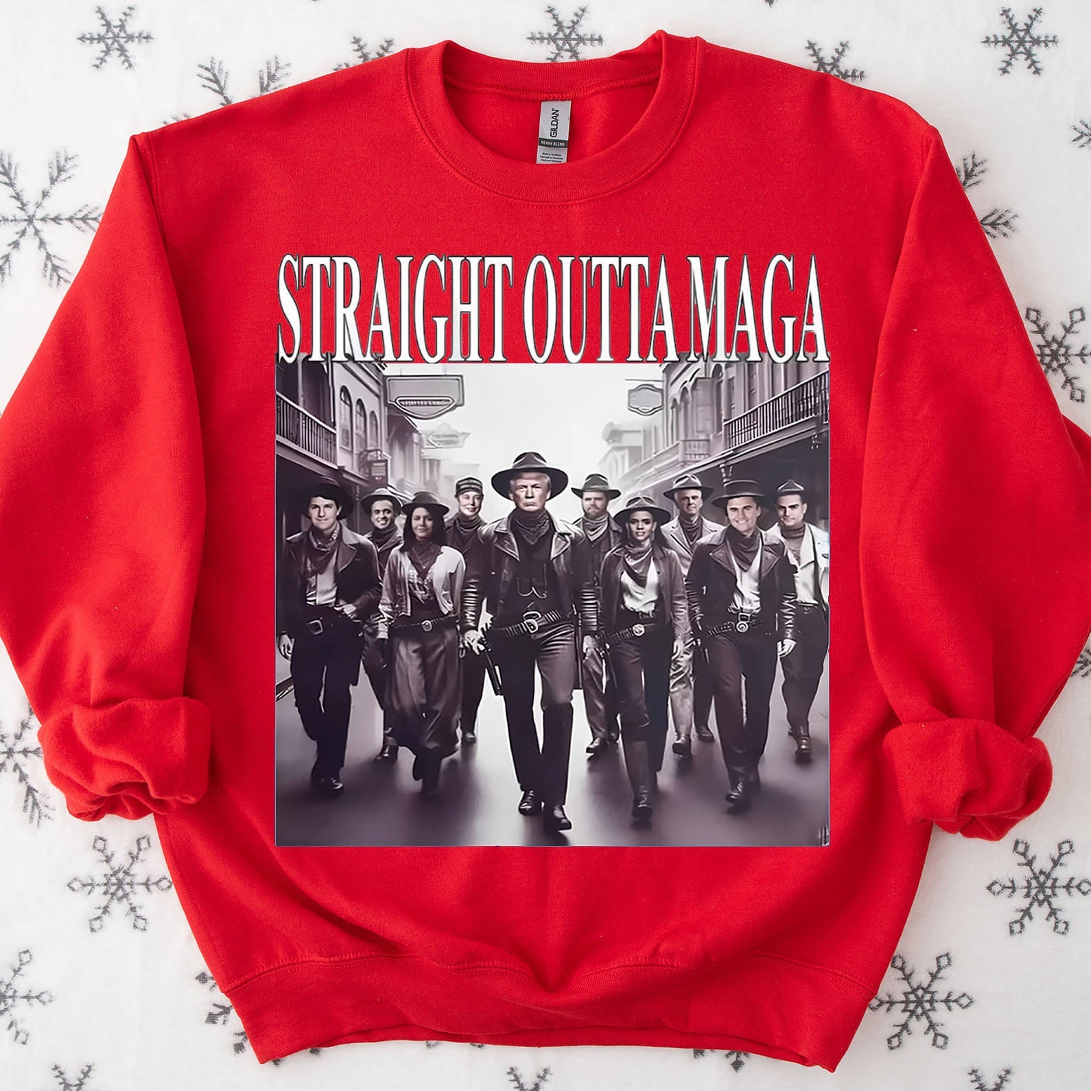 This sweatshirt design features a vintage black-and-white image of Republican Party dressed in Western attire, walking down a classic old-town street. The central figure, with a serious expression, is flanked by others in cowboy hats and bandanas, evoking a posse or gang from a classic Western movie. At the top of the image, the phrase "STRAIGHT OUTTA MAGA" is displayed in bold, capital letters in a font reminiscent of old movie posters. The design is edgy and humorous, blending contemporary political themes with classic Western aesthetics.