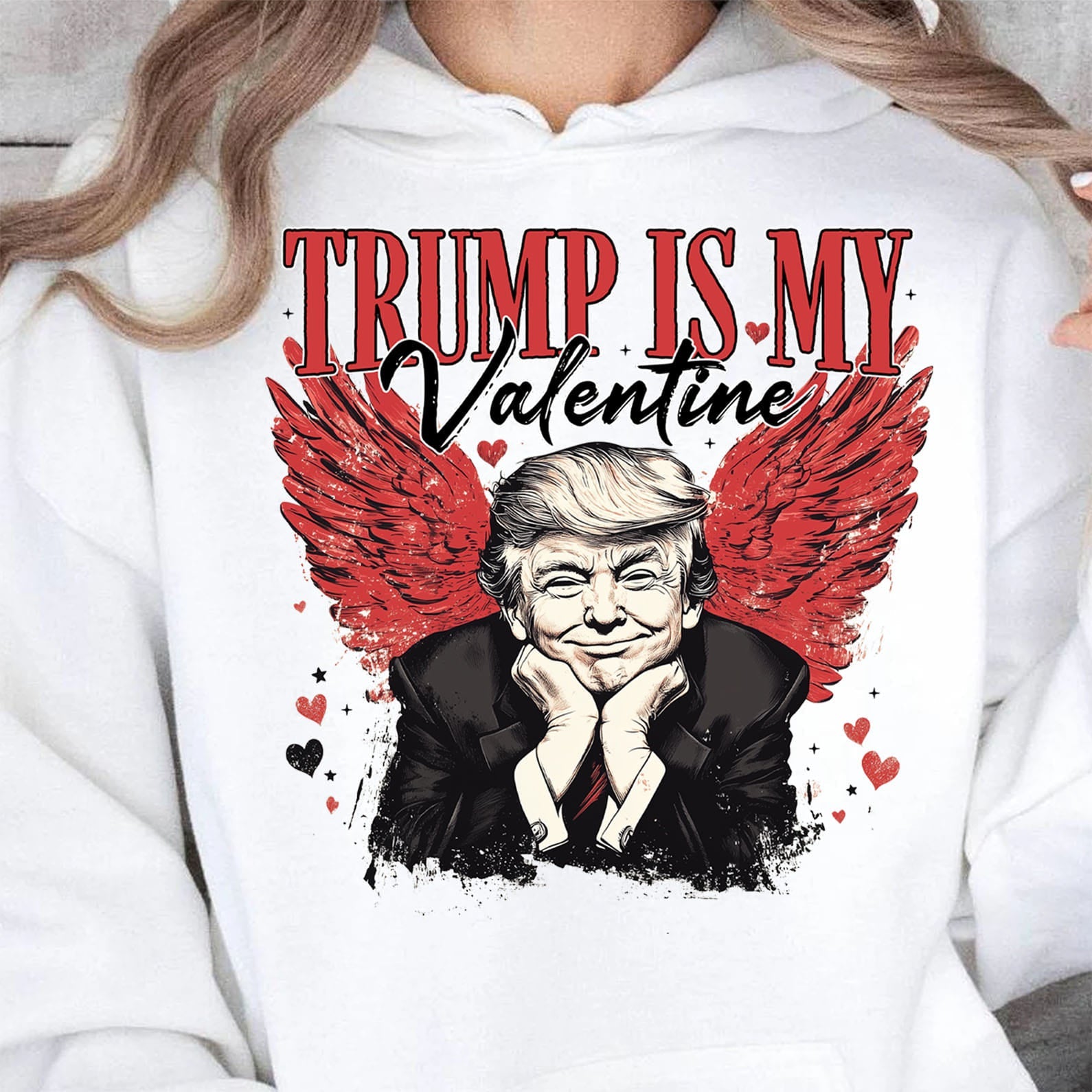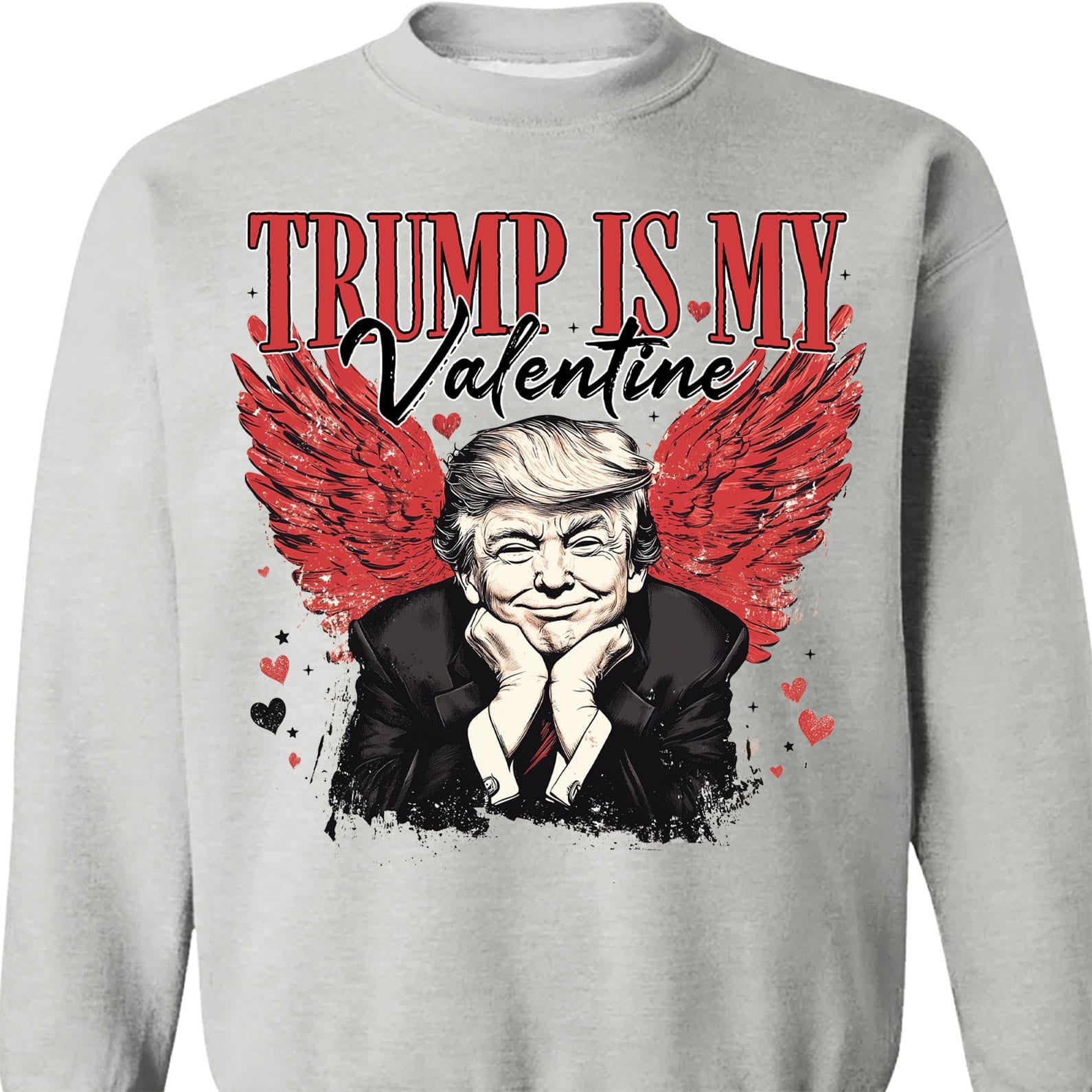 This sweatshirt design showcases a whimsical and bold illustration of Donald Trump, resting his chin on his hands with a playful expression. Behind him, a striking pair of distressed red angel wings spread outward, surrounded by scattered hearts and sparkles, enhancing the romantic and edgy aesthetic. The phrase "TRUMP IS MY Valentine" is prominently displayed above the image, combining bold serif and elegant script fonts for contrast and emphasis. Perfect for Valentine's Day, this design humorously blends admiration and festive charm, making it a standout gift for Trump supporters or anyone with a sense of humor.