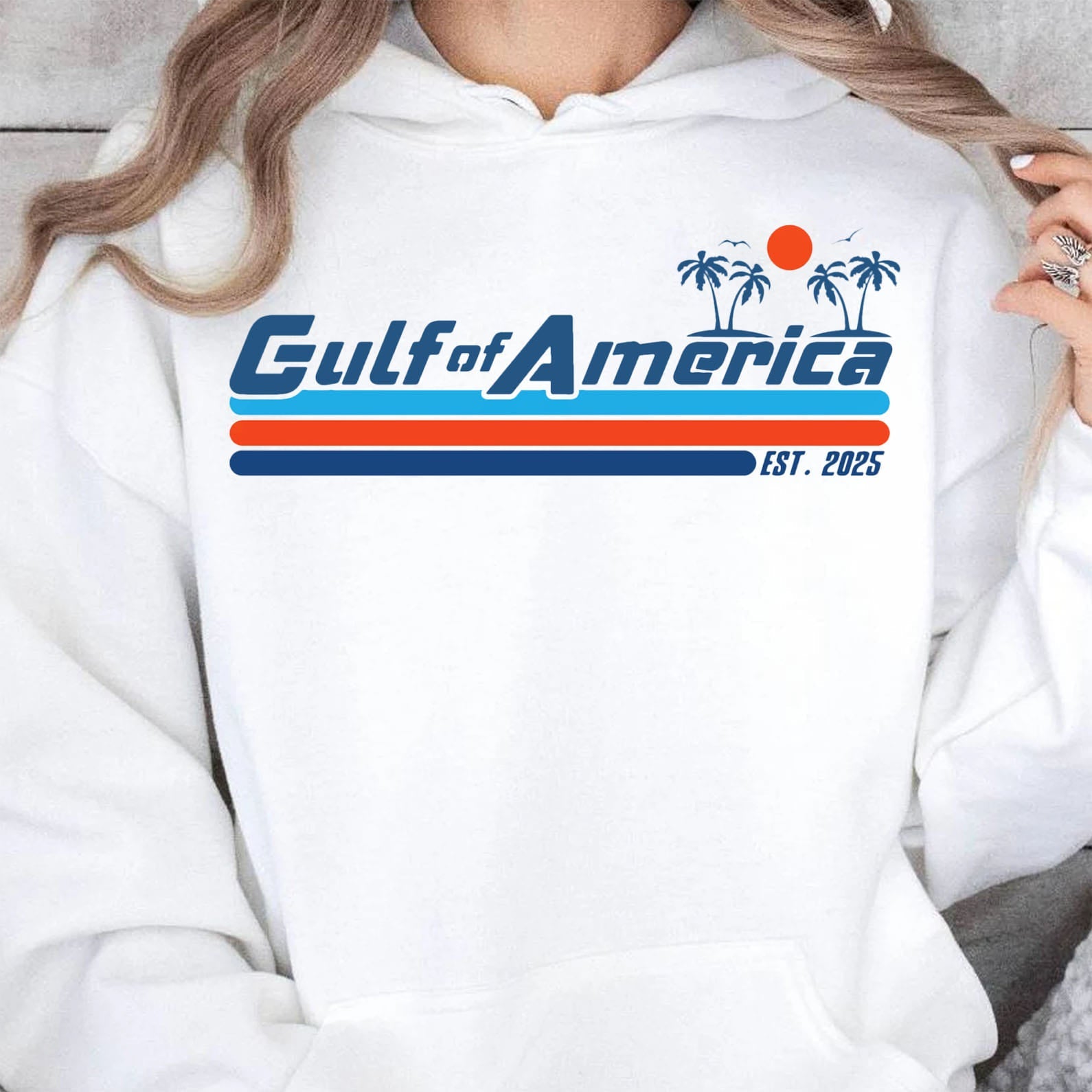 Embrace a retro vibe with our "Gulf of America" shirt a playful and bold statement piece with a vintage twist! This cream-colored sweatshirt features a striking design inspired by classic Americana, showcasing the phrase "Gulf of America" in a sleek, futuristic font. Palm trees, a sunset, and bold orange and blue stripes bring a laid-back, beachy feel, while the "Est. 2025" detail adds a fun, forward-looking touch. Perfect for trendsetters, beach lovers, or anyone who enjoys a clever twist on classic designs.