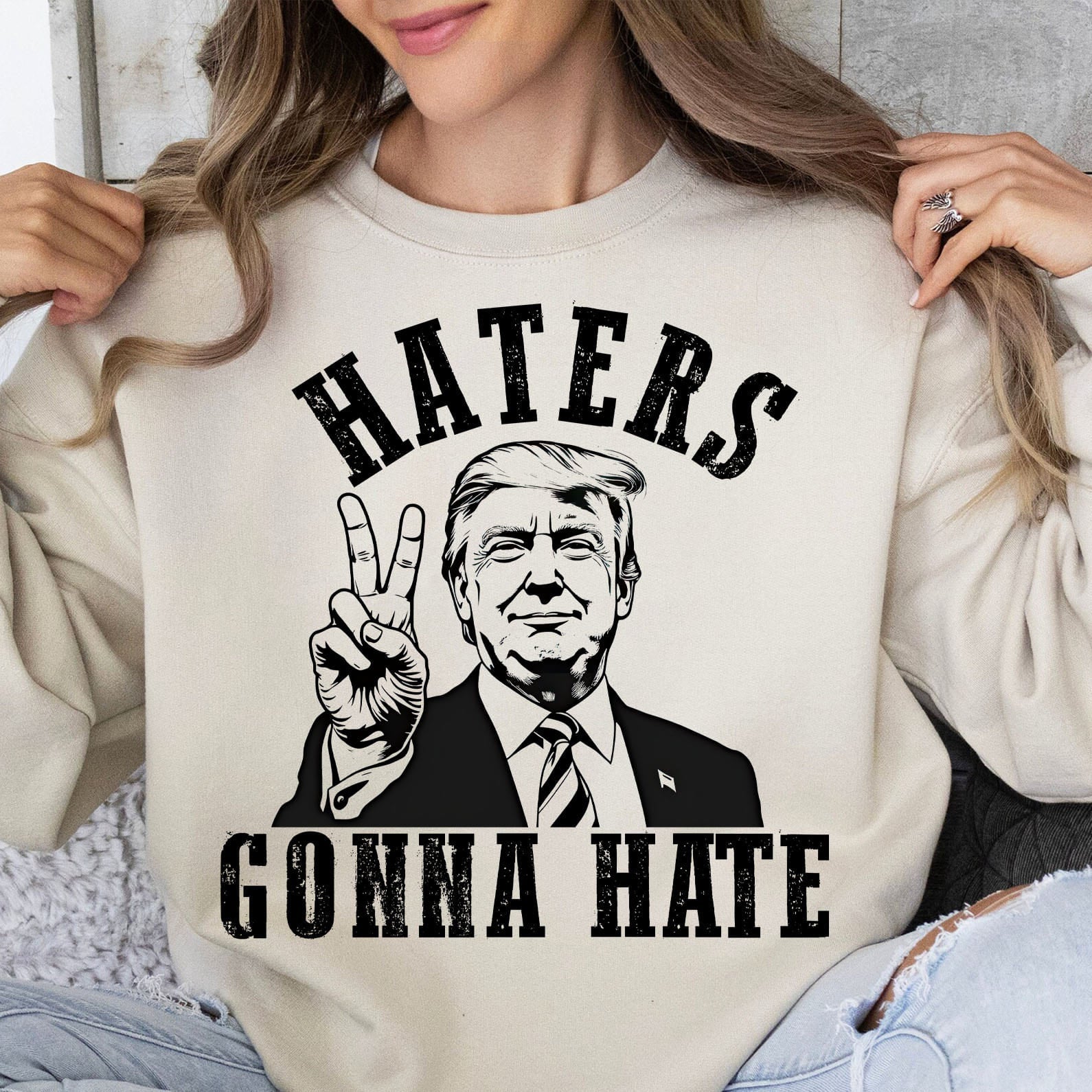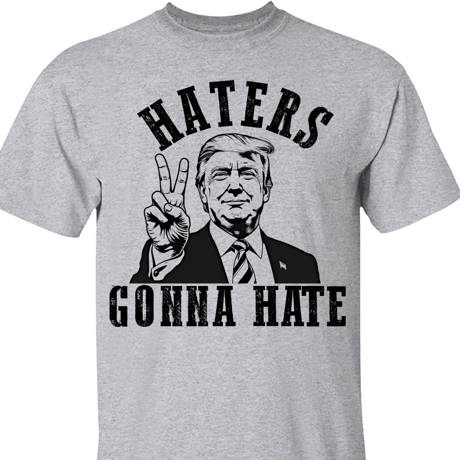 This shirt design features a bold black-and-white illustration of Donald Trump making a peace sign with his hand. Above him, the word "HATERS" is displayed in a large, serif font with a distressed, grunge style, giving it a rough, vintage look. Below the illustration, the phrase "gonna hate" is printed in the same font and style, completing the phrase in a bold and edgy way. The minimalist black-only color scheme makes the design striking and visually impactful, delivering a strong statement with a simple yet powerful aesthetic.