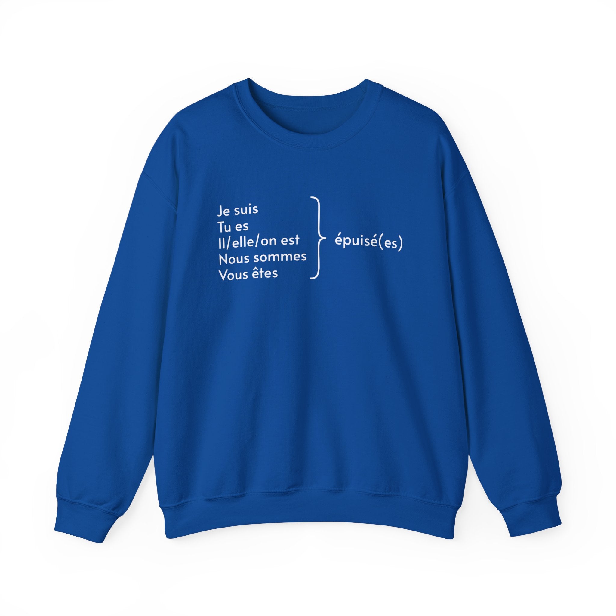 Je suis épuisée (I am exhausted) French grammar sweatshirt ‐ Royal / L