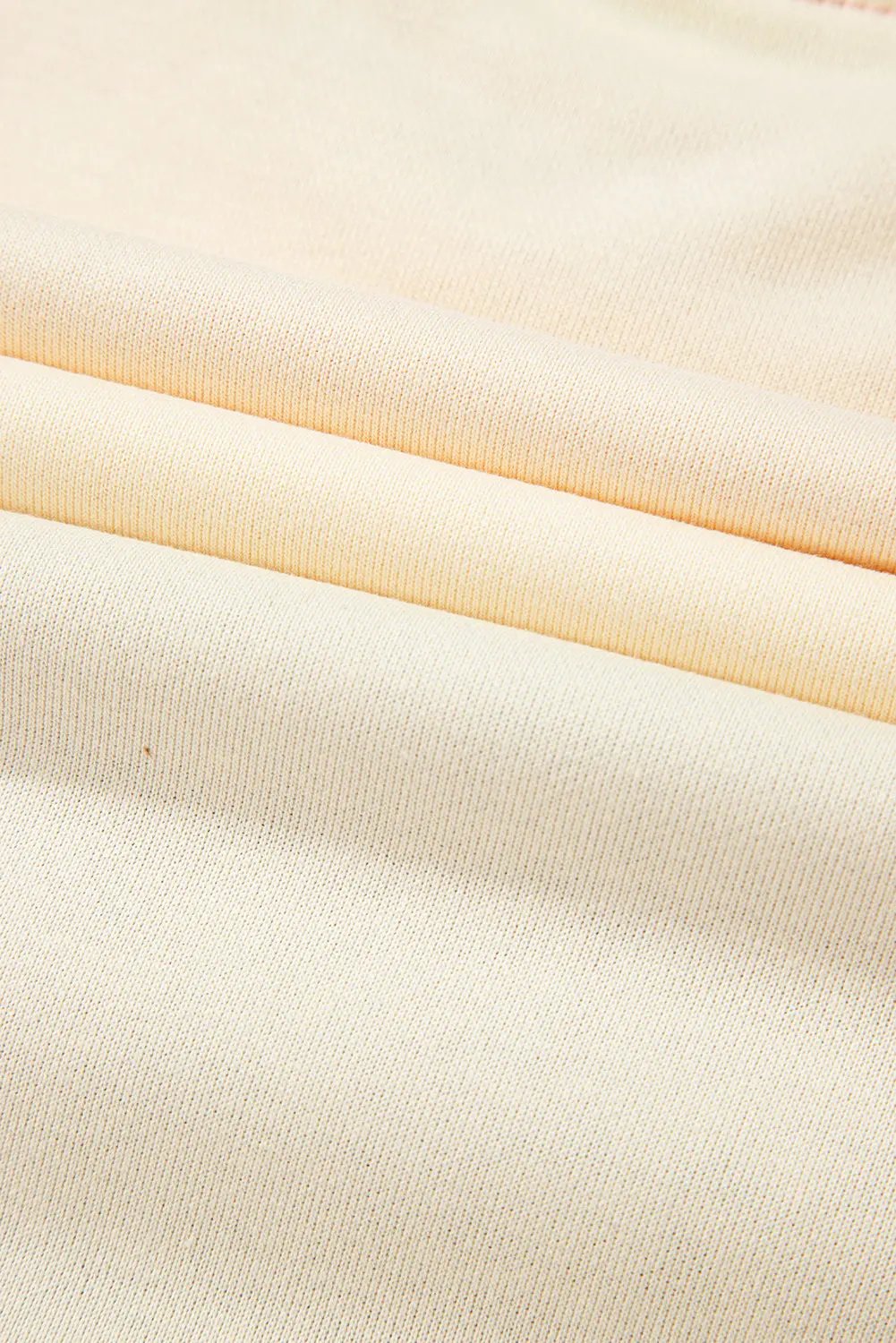 Design highlights include pastel colorblock panels in pink, cream, and lavender, with a casual drop-shoulder shape that drapes naturally over the body. The fabric blends 70% polyester and 30% cotton for softness, durability, and easy care. The piece is versatile for lounging at home, running errands, or layering beneath outerwear on cooler days.