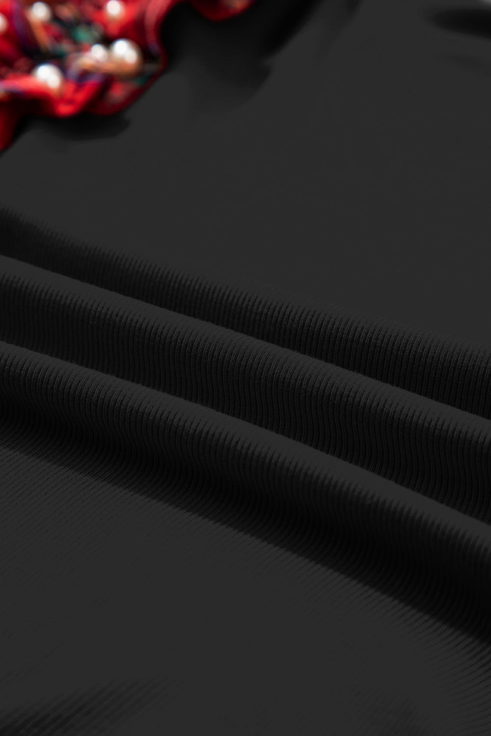 Plaid Patchwork Pearl Ruffle Sleeve T-Shirt ‐ Black / XL