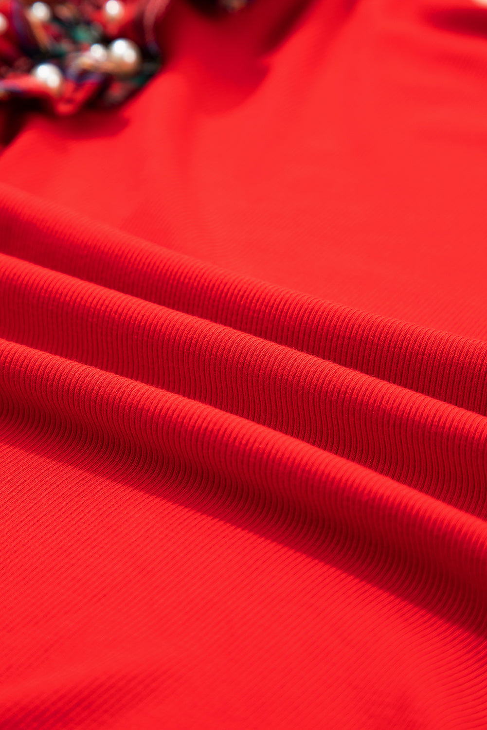 Plaid Patchwork Pearl Ruffle Sleeve T-Shirt ‐ Racing Red / S
