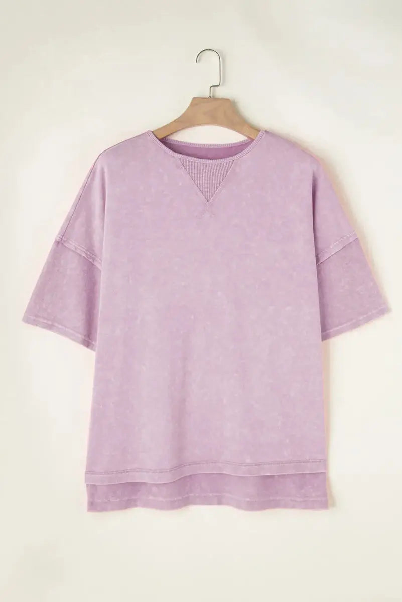 Experience everyday comfort with a versatile tee designed for curvier silhouettes. Crafted from a soft 85% cotton and 15% polyester blend, it delivers breathable, lightweight wear with a smooth drape. The opaque fabric provides full coverage, while the relaxed cut flatters without cling. The round neckline and half sleeves offer a timeless, easy-to-layer silhouette in a soft pink color with a subtle washed finish.