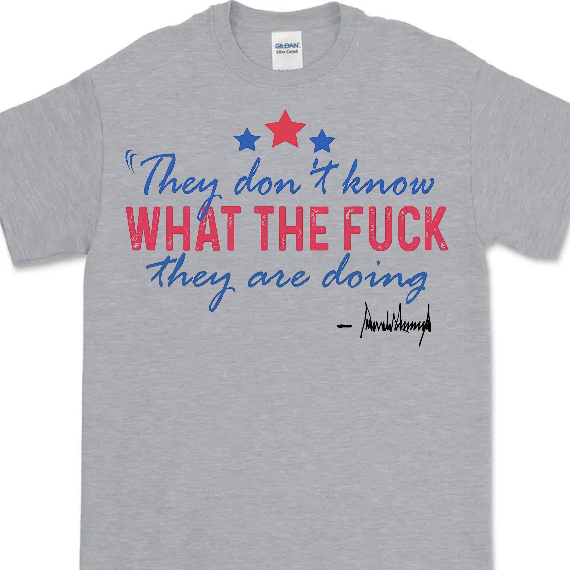Speak volumes without saying a word. This shirt features the blunt and viral Trump quote "They Don’t Know What The F* They Are Doing"** in bold red, white, and blue typography, complete with stars and a stylized signature. Whether you're into political satire, unfiltered speech, or bold commentary, this tee says it all – loud and clear.