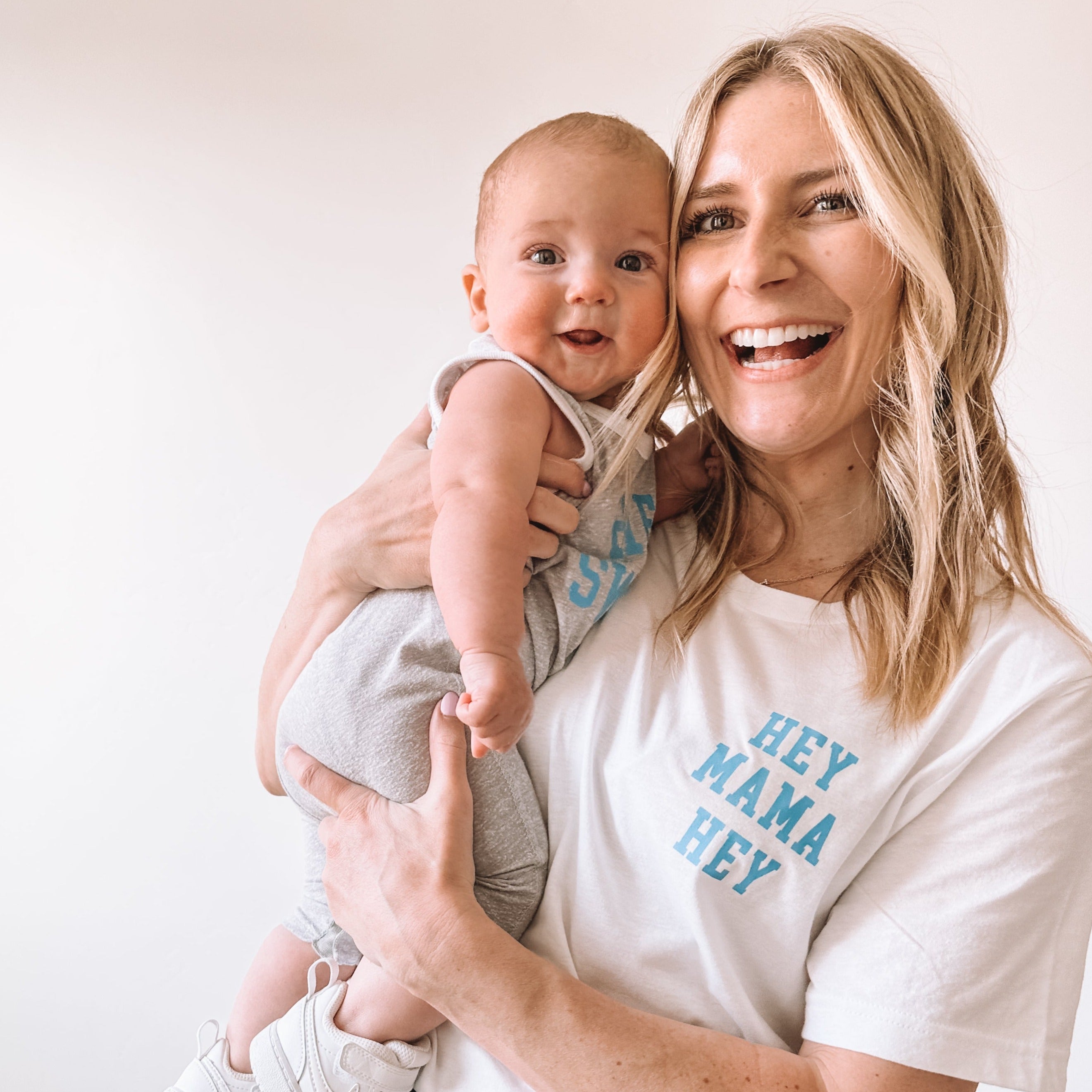 LMSS X JENN HALLAK - Hey Mama Hey (Pocket Design) - Unisex Tee ‐ S / Natural w/ Bright Blue