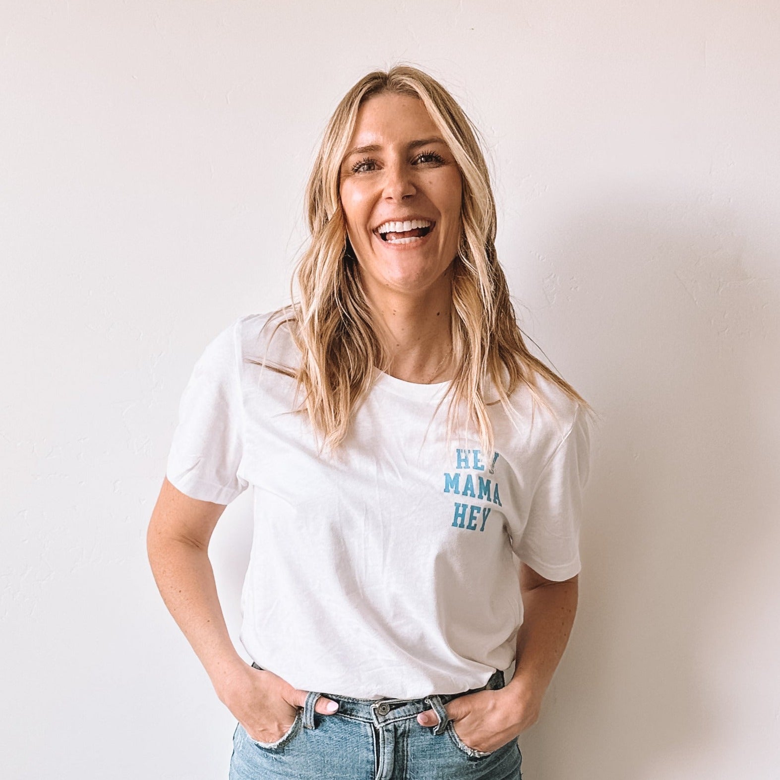 LMSS X JENN HALLAK - Hey Mama Hey (Pocket Design) - Unisex Tee ‐ XS / White Crewneck w/ Bright Blue