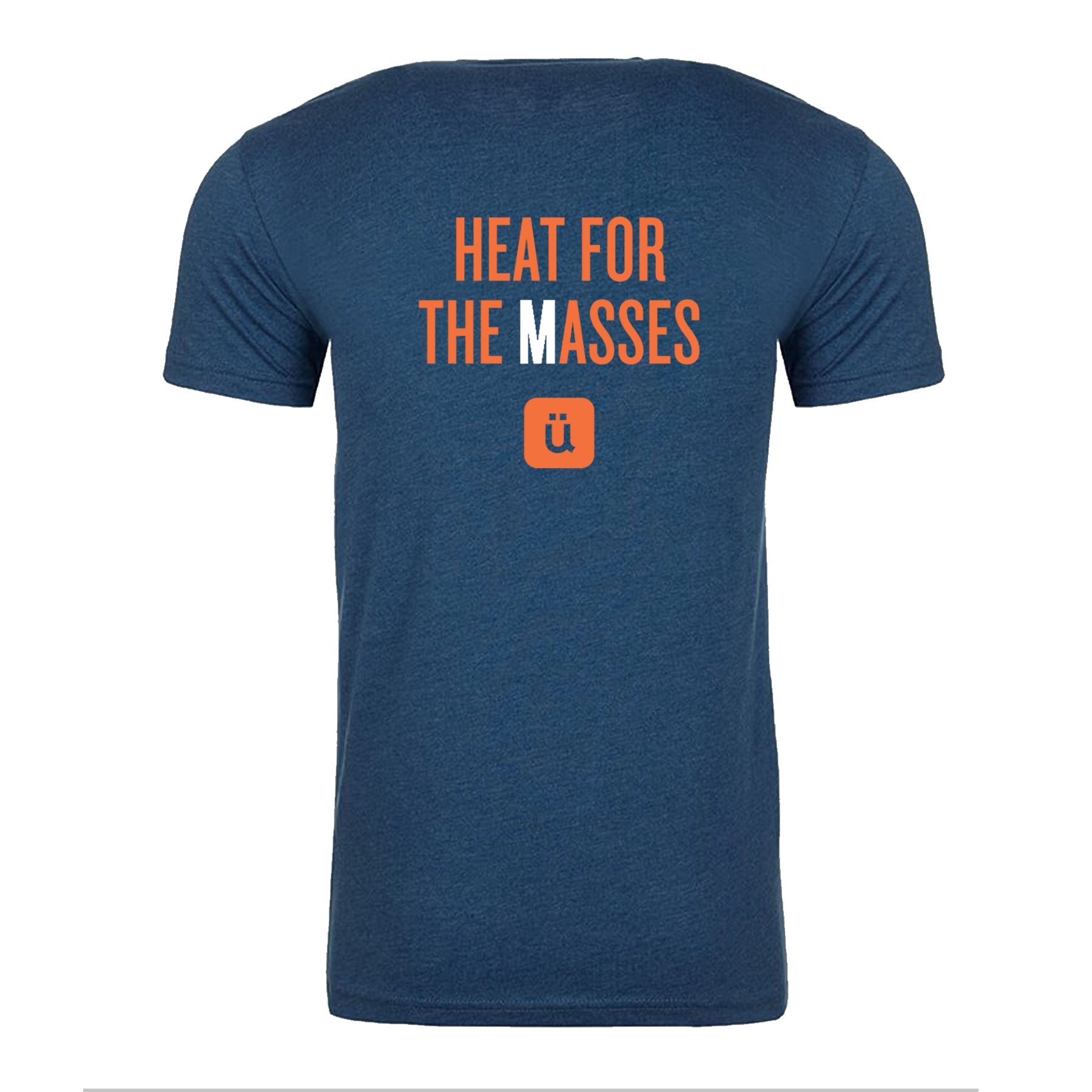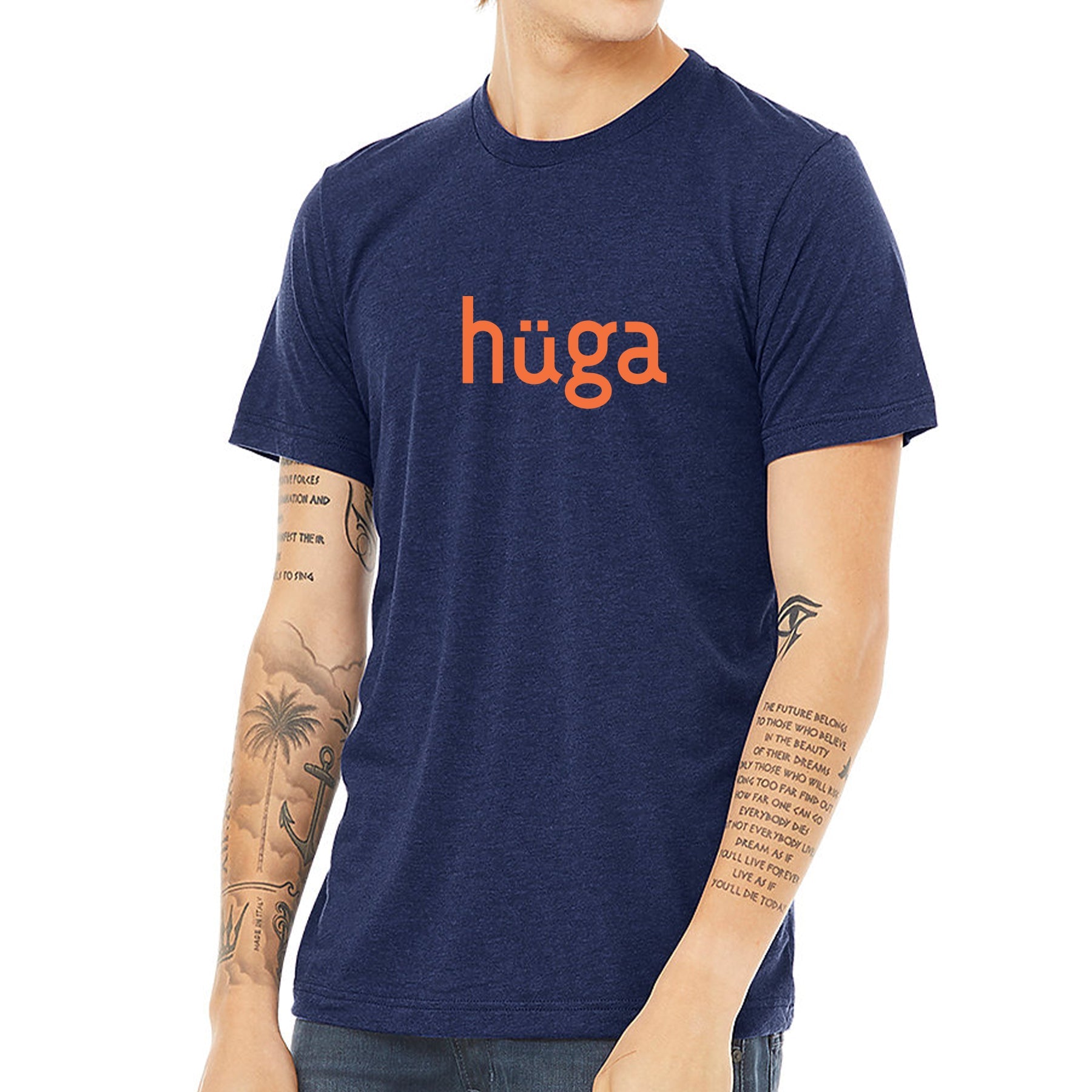 Our classic "hüga logo" t-shirt. You can show off your love of hüga with our classic "hüga logo" t-shirt, back has our signature "u" with text "HEAT FOR THE MASSES". Available in crew neck fit with "hüga orange" print on heather tri-blend navy.