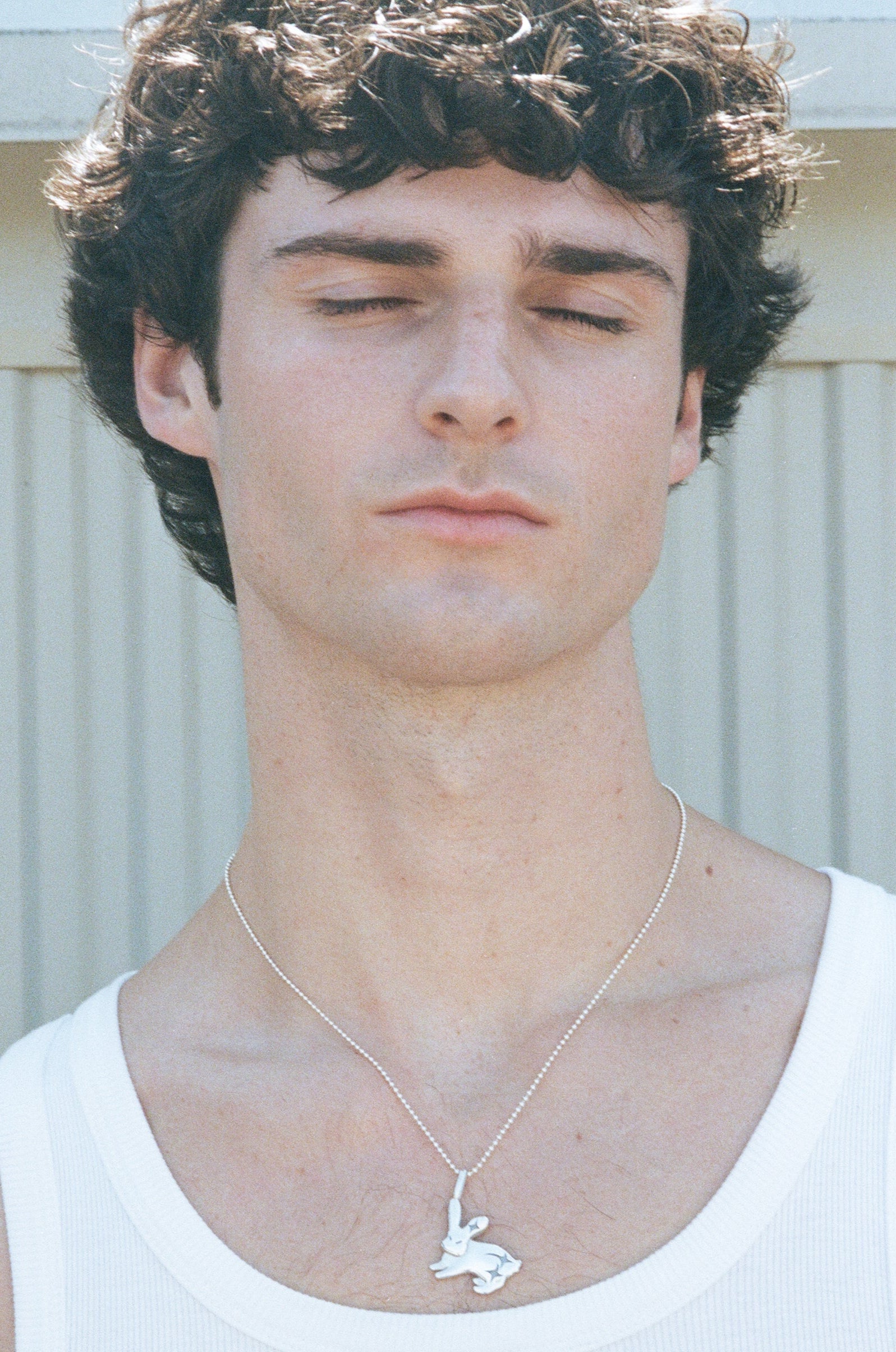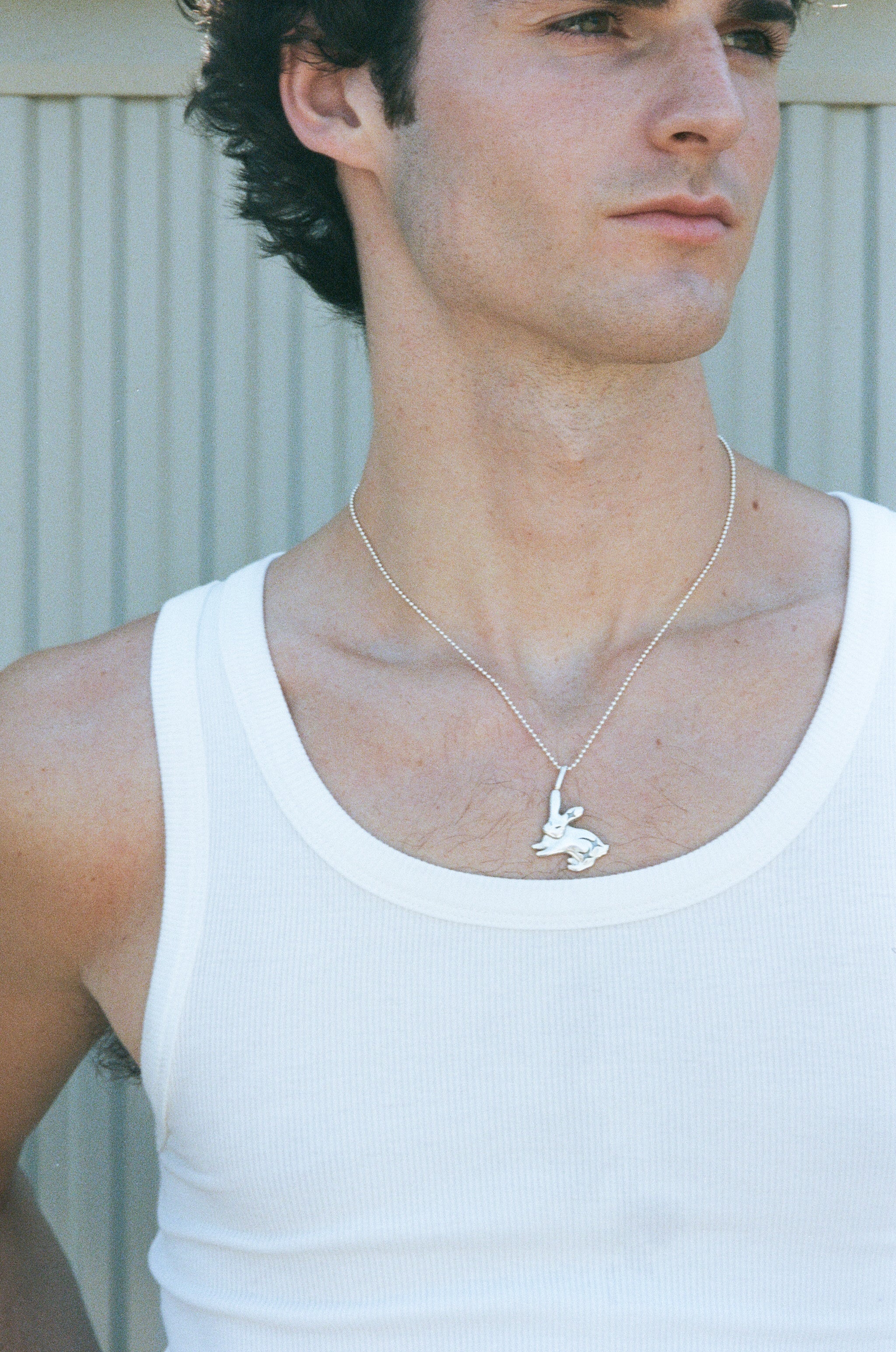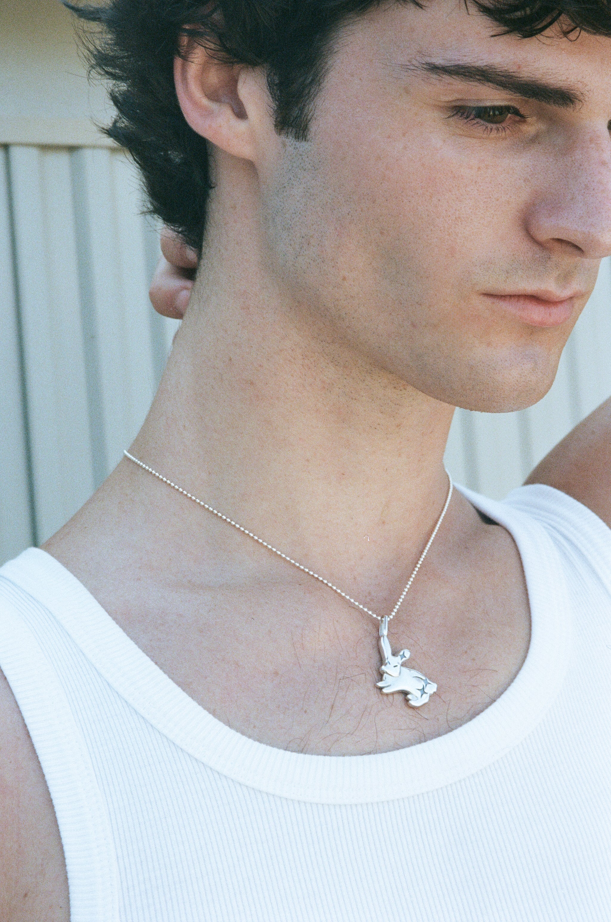 - Small, 32.74 x 25.56 x 3.39 mm bunny pendant with ball-style chain and paperclip-style bail