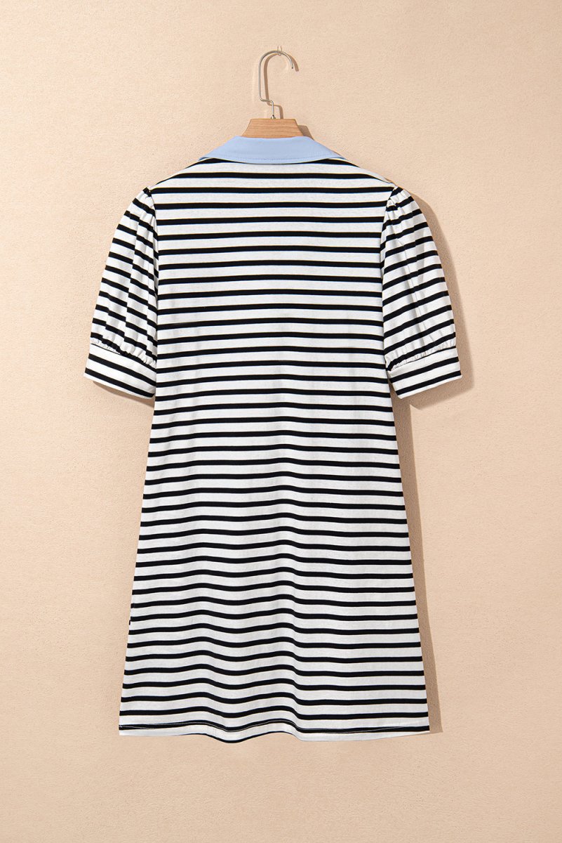 Black Stripe Contrast V Neck Collared Puff Sleeve T Shirt Mini Dress with Pockets