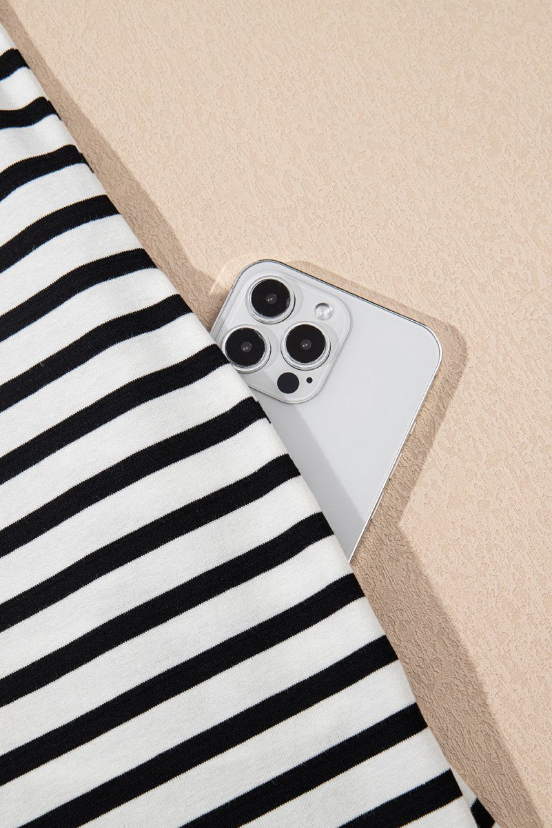 Don’t miss out on the perfect blend of style and comfort. Order your Black Stripe Contrast V Neck Collared Puff Sleeve T Shirt Mini Dress with Pockets today!