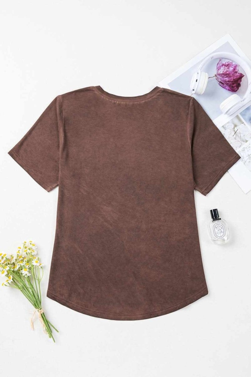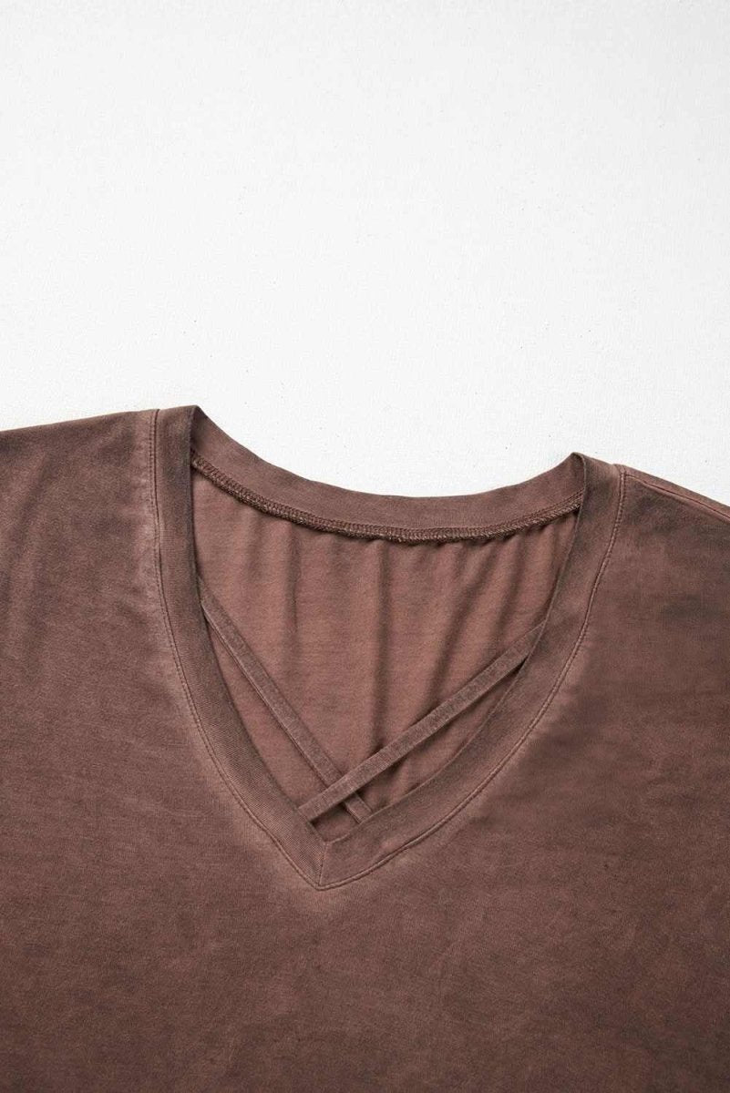 Chestnut Criss Cross V Neck Casual Tee with Unique Mineral Wash