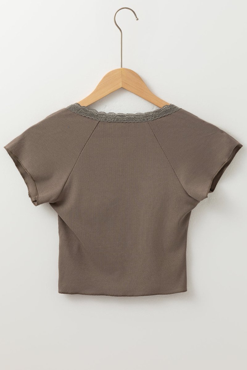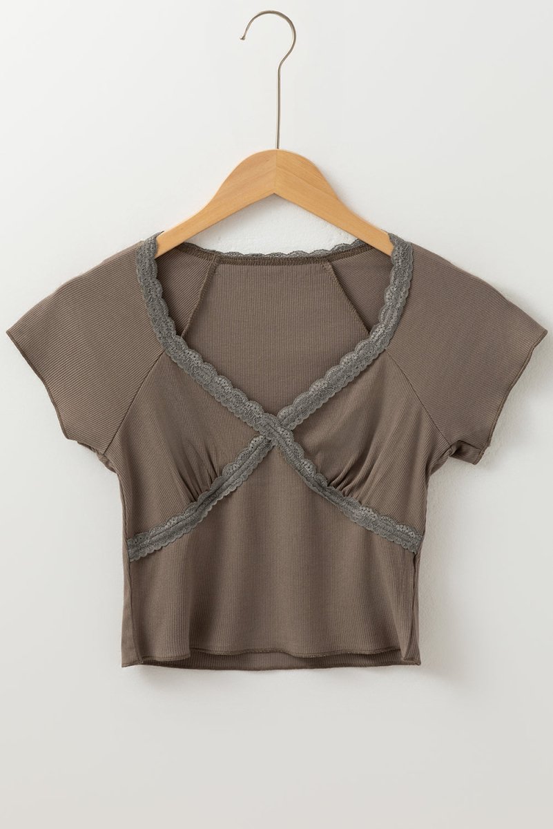 Dark Brown Lace Splicing Criss Cross Slim Fit V Neck T Shirt