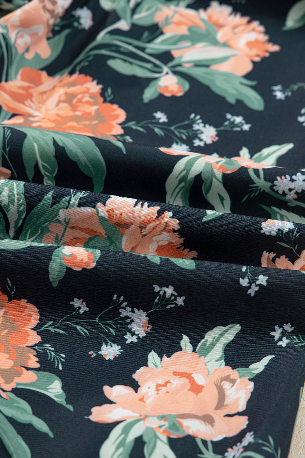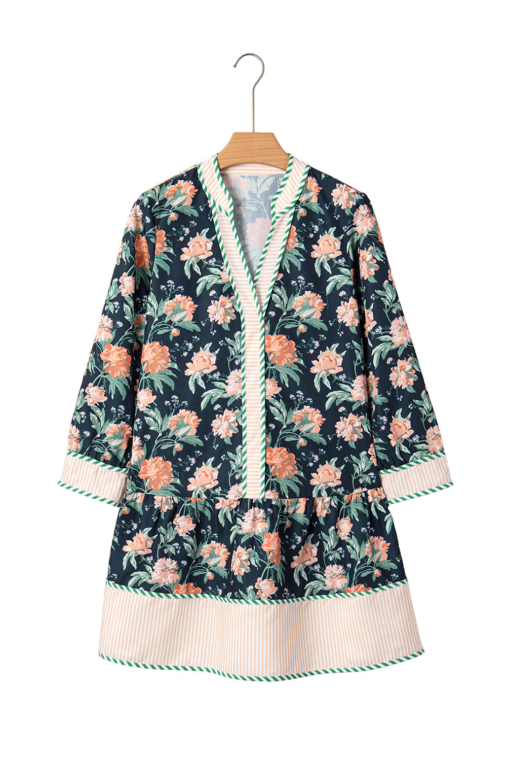 Floral Stripe Trim V-Neck Ruffle Hem Mini Dress