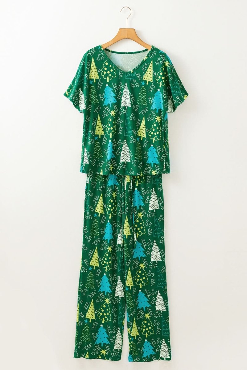 Green Christmas Tree Print V Neck Tee and Pants Lounge Set
