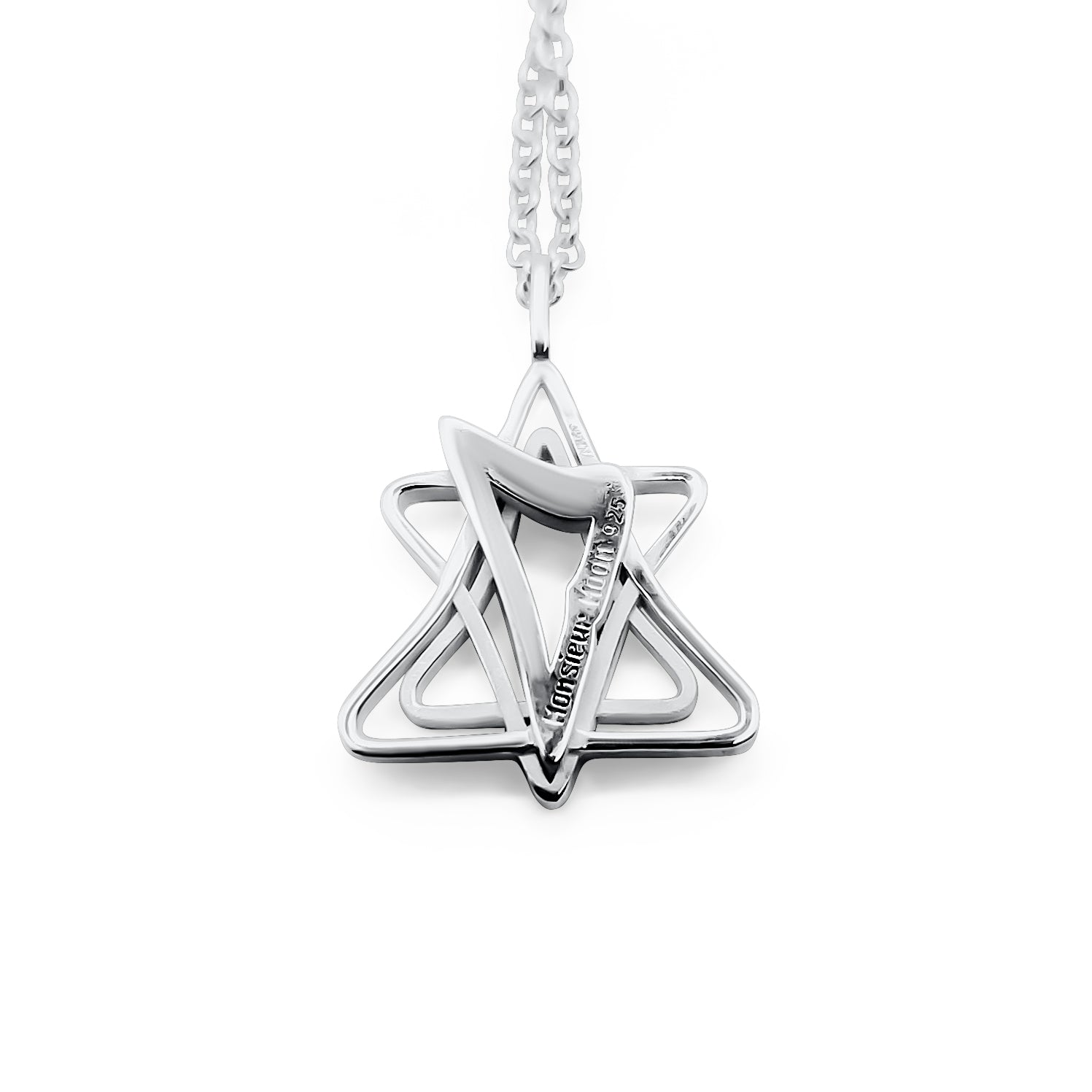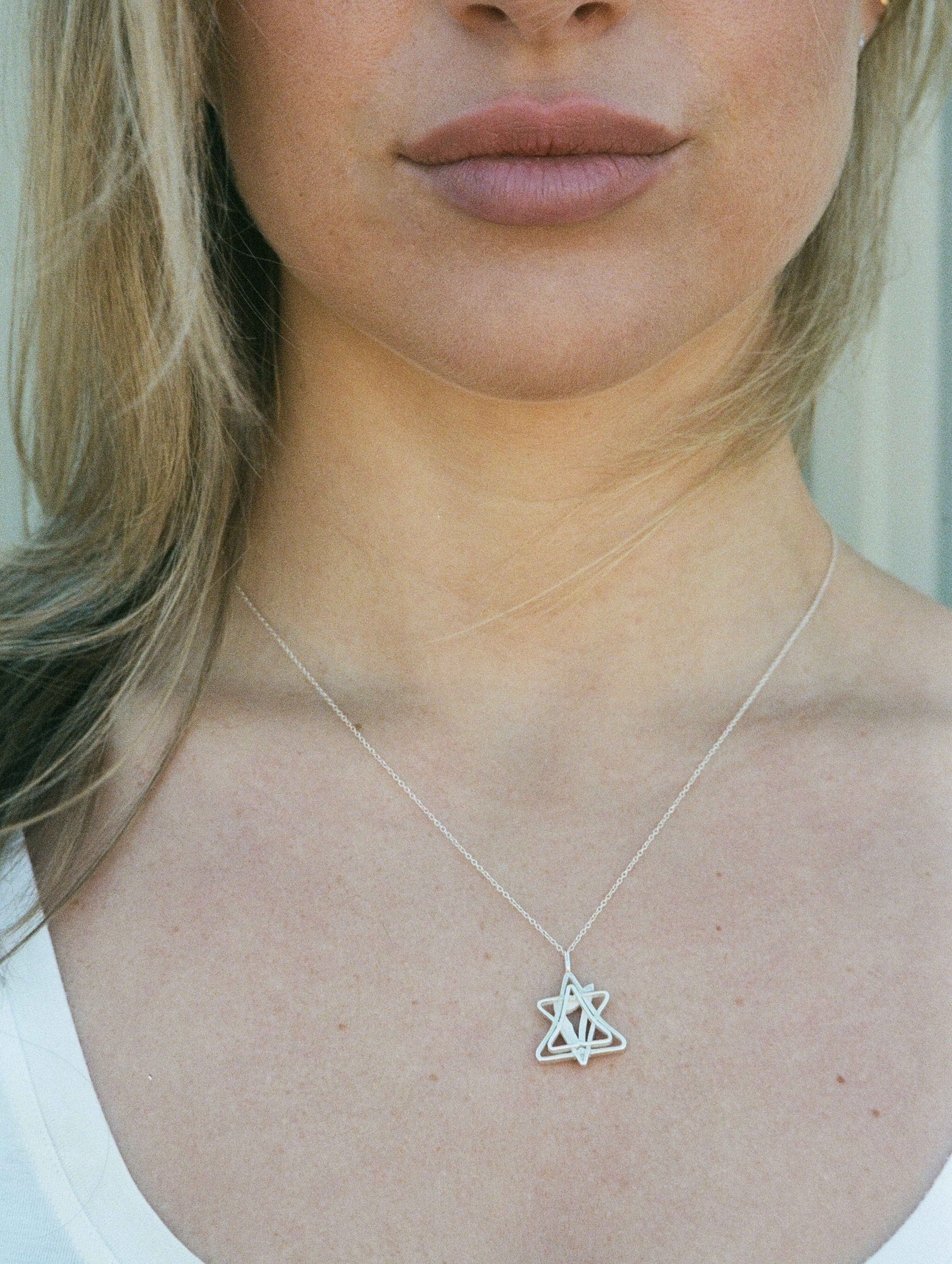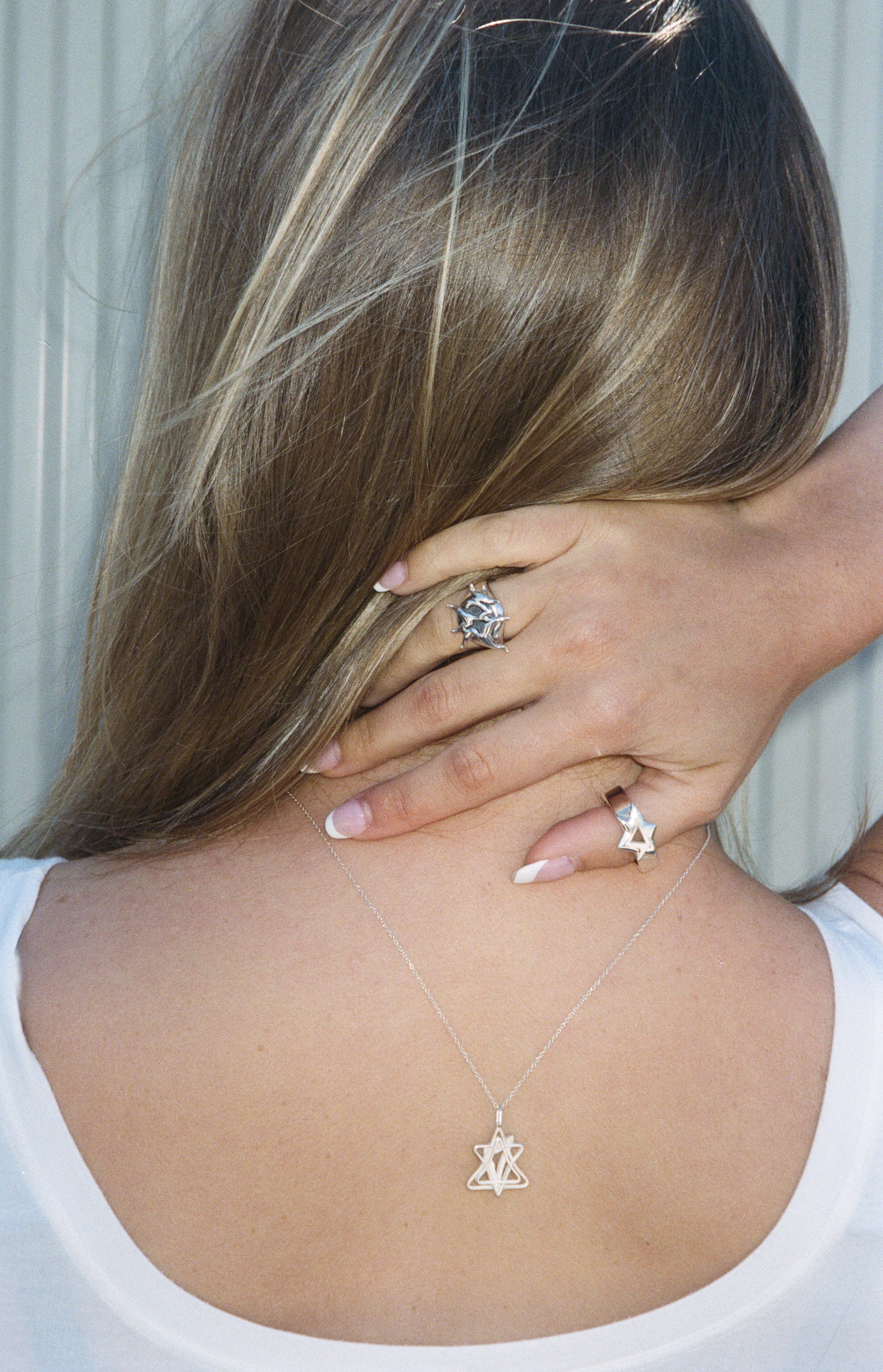 The Kohav is a little star that came into being of a momentary glimmer, that is unlike others of its kind. As a collection of interlocking shapes -- of lines curving and flat -- it captures and twinkles in the light, despite its small stature. The meeting of subtlety and strength.