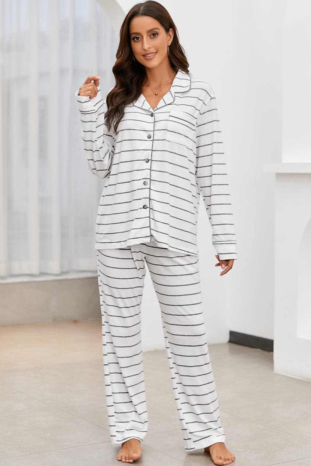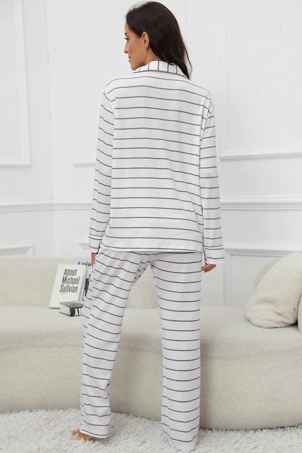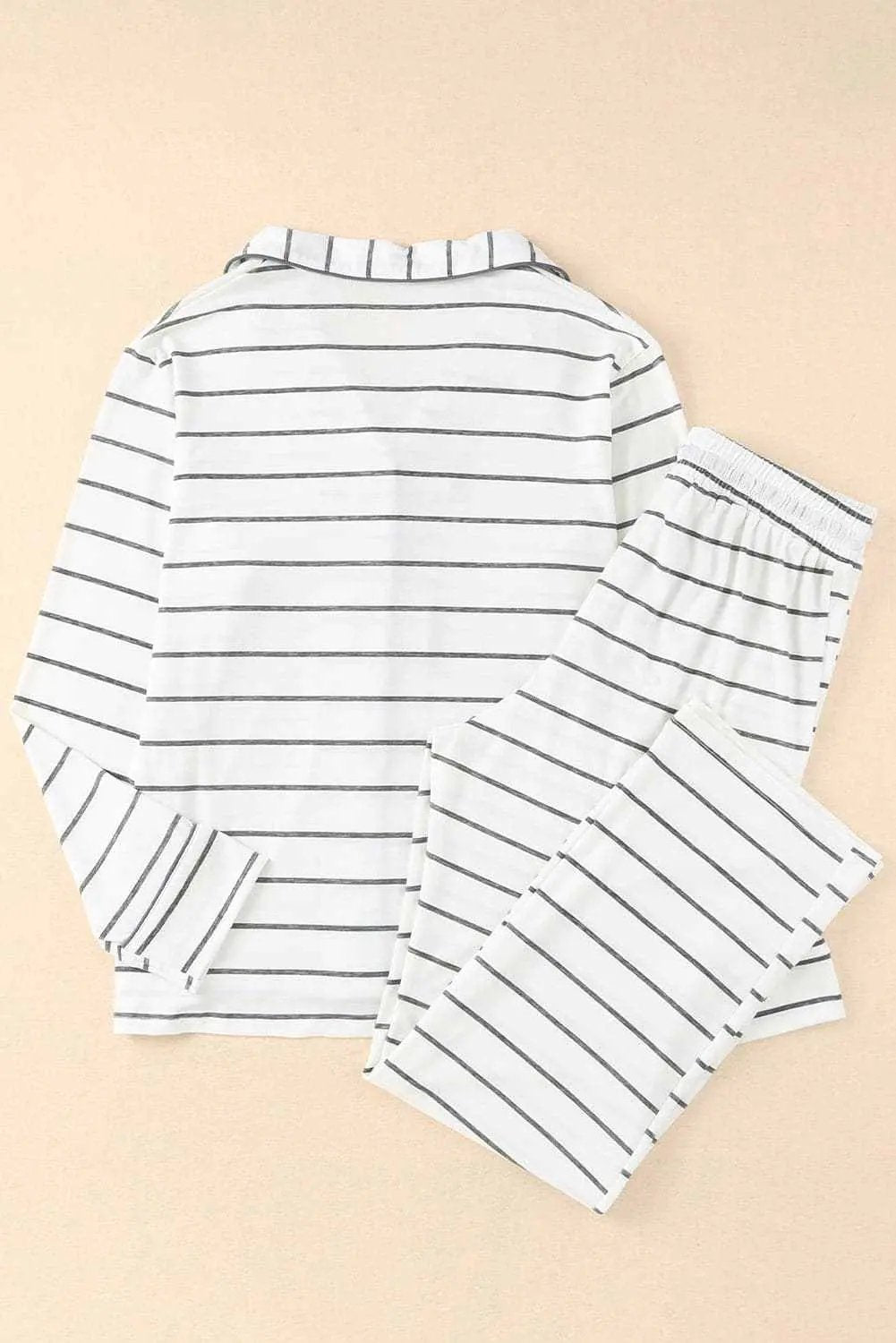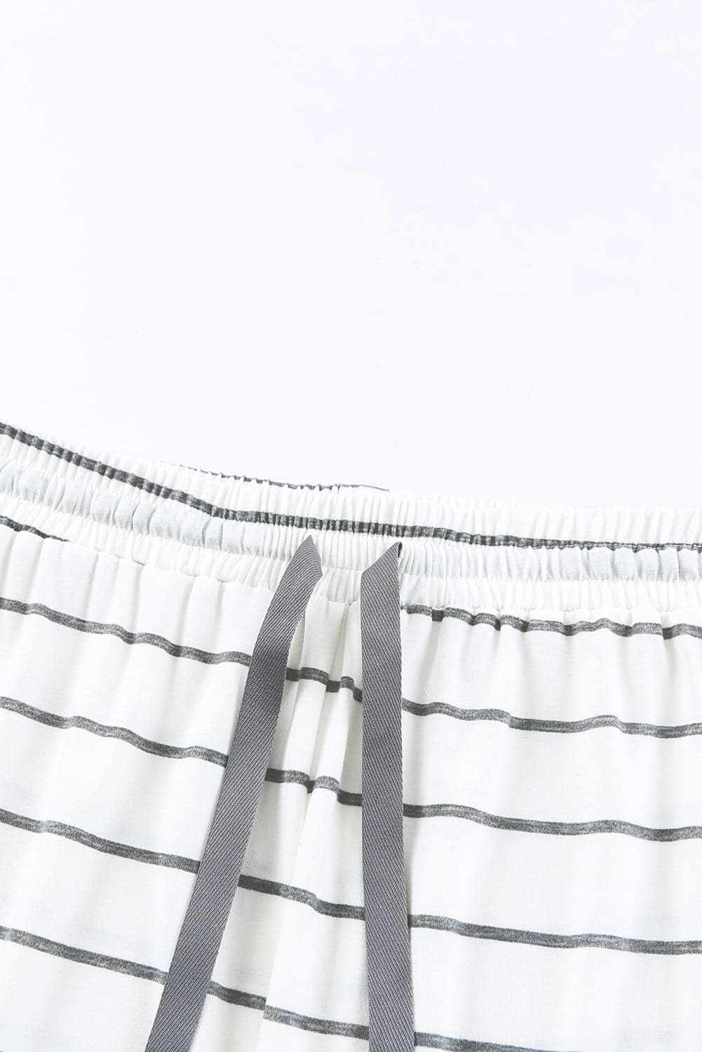 Chic Striped Lounge Set Elevate your comfort with this stylish two-piece lounge set. The chic v-neck top pairs perfectly with drawstring pants, offering a flattering fit for any body type. Material: 95% polyester, 5% elastane for slight stretch. Care: Machine wash cold; tumble dry low. Sizing: Available in S, M, L, and XL. Perfect for lounging or casual outings, this set combines functionality with a modern flair.