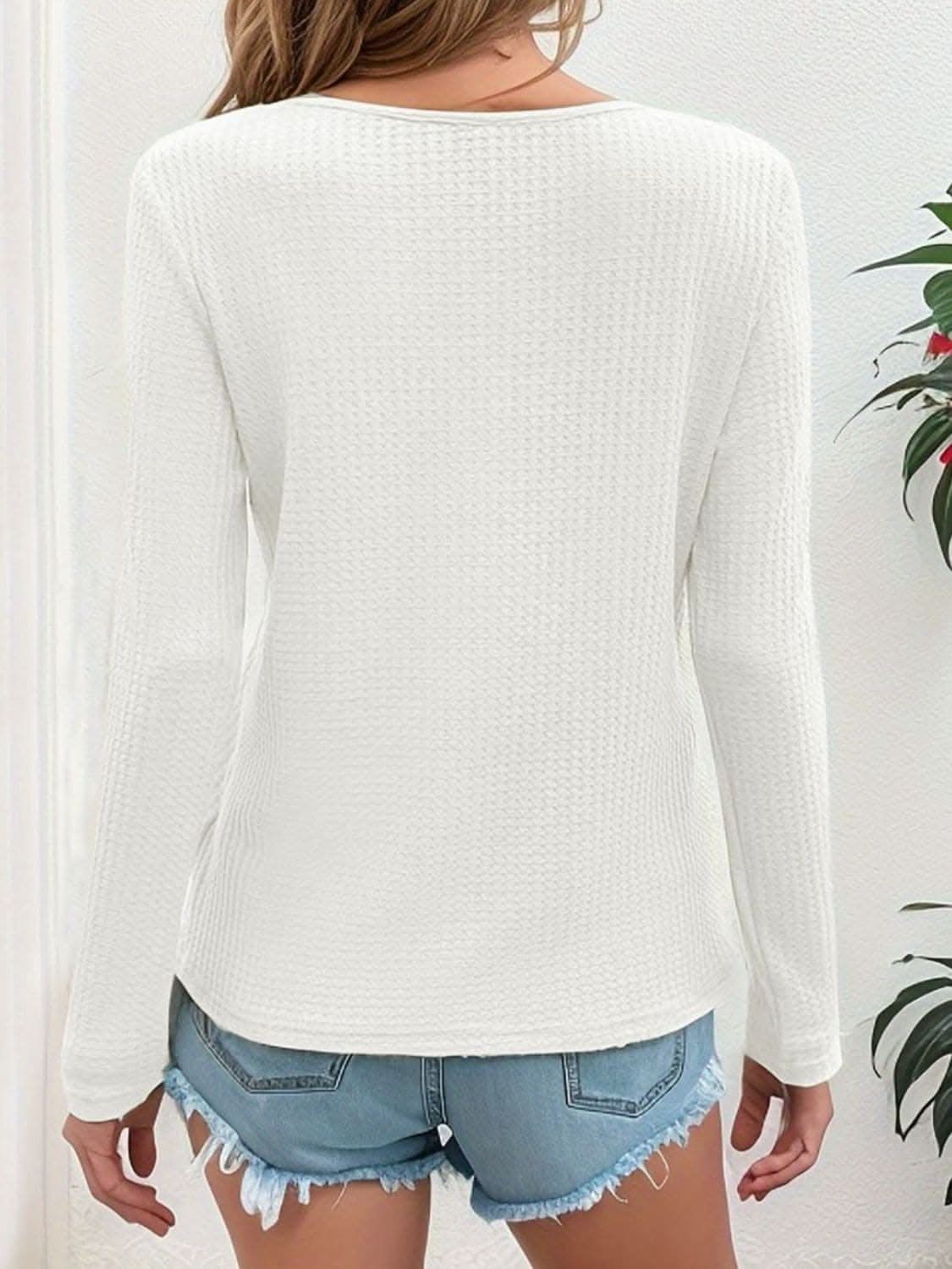 Waffle-knit v-neck long sleeve tee