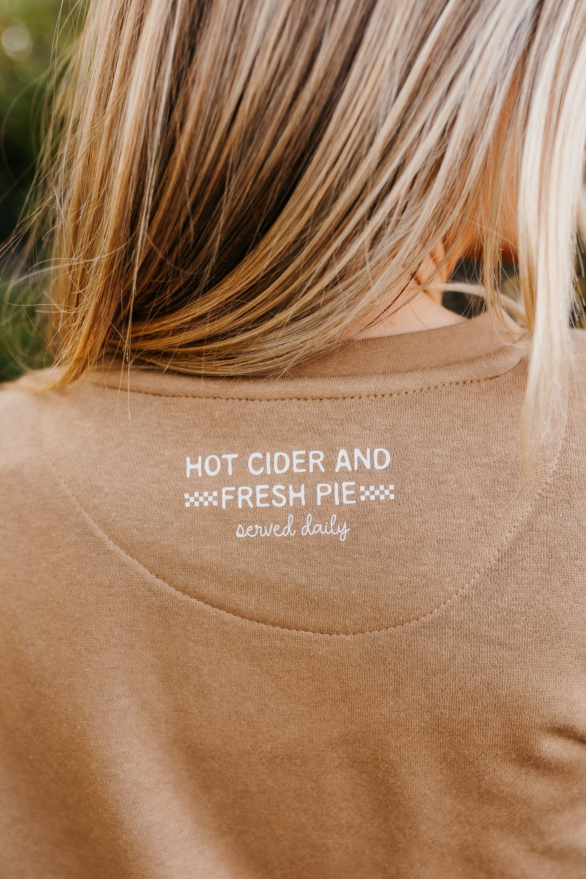 Celebrate the best parts of autumn with this cozy and complete harvest design. The front features a charming collage of all your fall favorites. On the back, a subtle and sweet detail reads "HOT CIDER AND FRESH PIE served daily." It's the perfect design for anyone who loves cozy gatherings, good food, and the beautiful, bountiful spirit of the season.