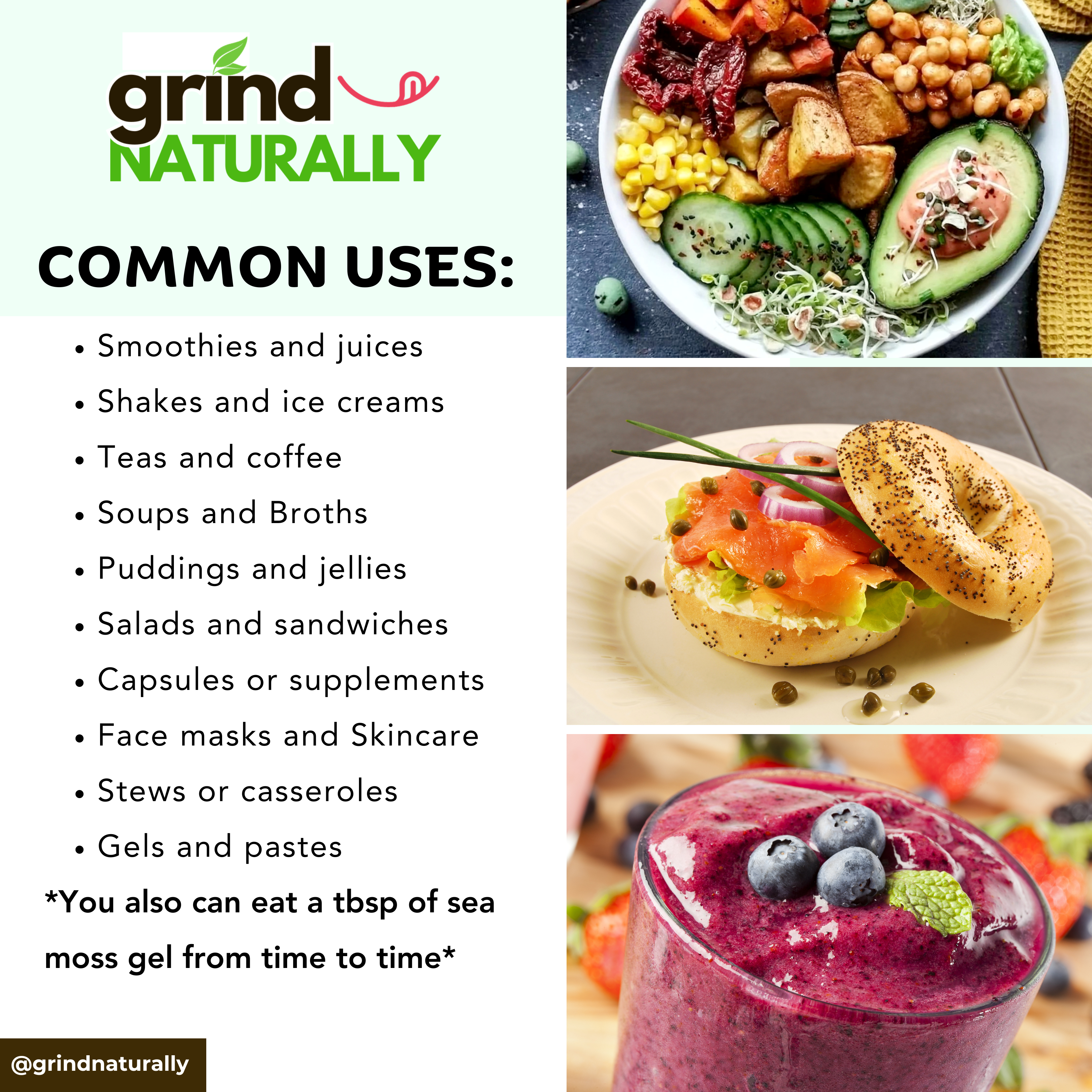 Our high-quality, organic, award-winning sea moss gel, harvested near the coasts of St. Lucia, is known for its numerous health benefits. We make our sea moss gels to PERFECTION: delicious flavor with a smooth and thick consistency. Water is the key: We use ionized alkaline water to mix the best with the best. Grind Naturally sea moss gel is naturally packed with over 92 vitamins and minerals to help you nurture your body inside and out. No chemicals or artificial colors are used in production. Naturally gluten-free, vegan-friendly, GMO-free, and kid-friendly! Proudly made in the US!