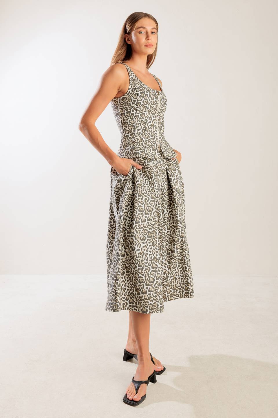 A leopard-printed woven vest featuring U neckline, sleeveless and front zipper closure.