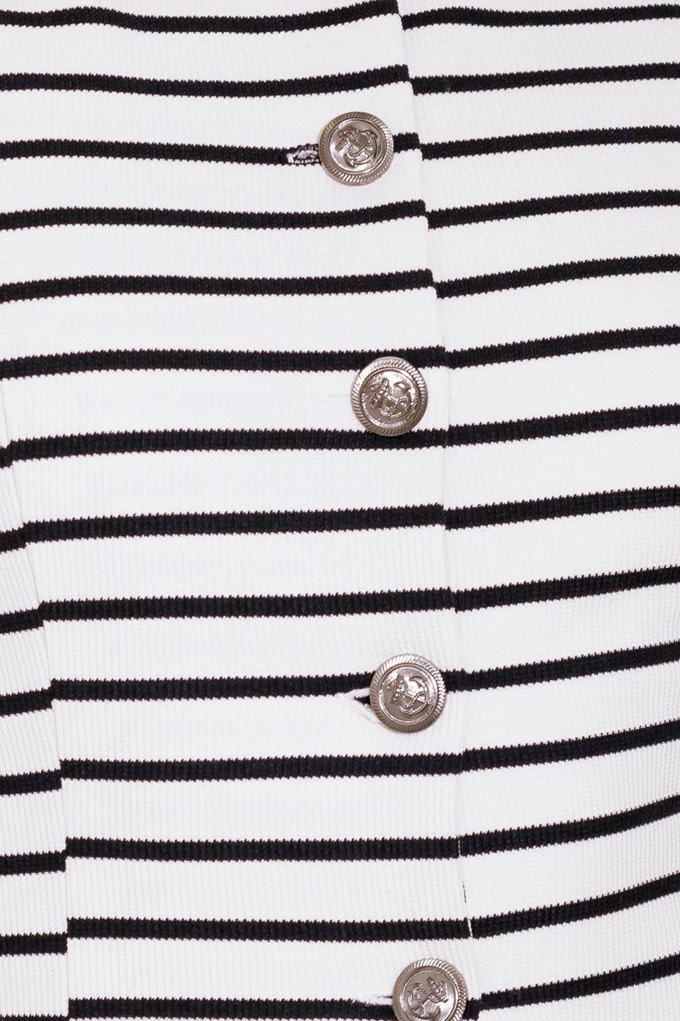 A white and black striped woven vest featuring round neckline, sleeveless and button down. Matching skort FP1646