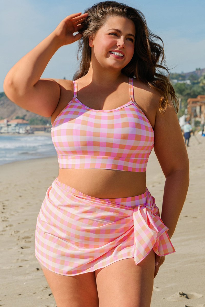 Pink Plus Size Plaid Print High Waist Bikini Set ‐ Pink / 1X / 85%Polyester+15%Elastane