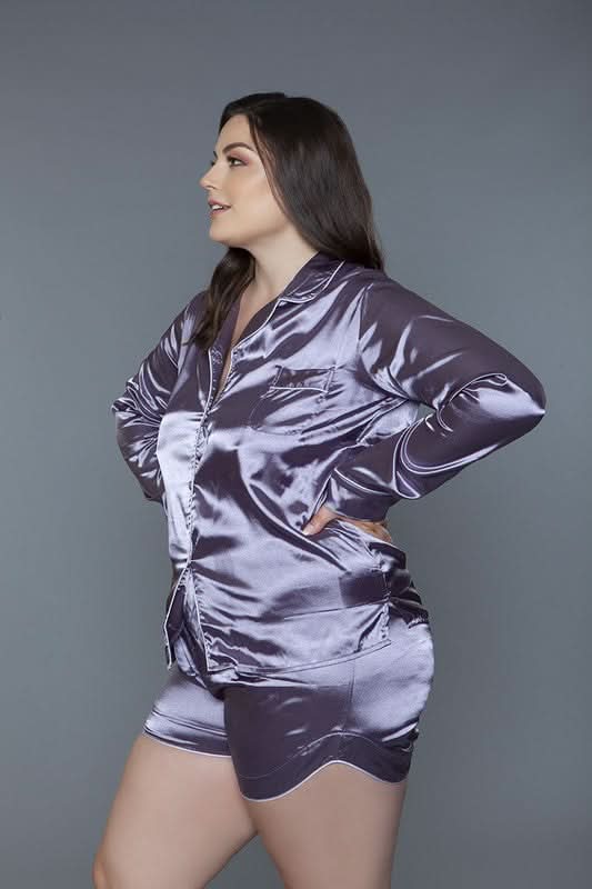 Indulge in the epitome of comfort and elegance with the BE WICKED Liz PJ Set in a captivating Lilac color, available in size 1X. This luxurious pajama set is meticulously crafted from premium quality polyester satin, ensuring a silky-smooth feel against your skin for a restful night's sleep or a relaxed day at home. The top features a classic notched collar and long sleeves, complemented by a convenient button-down closure and a chest pocket for a touch of functionality. The bottoms are designed with an elastic waistband and a satin drawstring, allowing for a customizable fit that adapts to your comfort needs. The set is accented with contrast decorative piping, adding a refined touch to this sophisticated loungewear ensemble. Whether you're winding down for the evening or enjoying a leisurely morning, the BE WICKED Liz PJ Set combines style, comfort, and quality, making it an essential addition to your sleepwear collection.