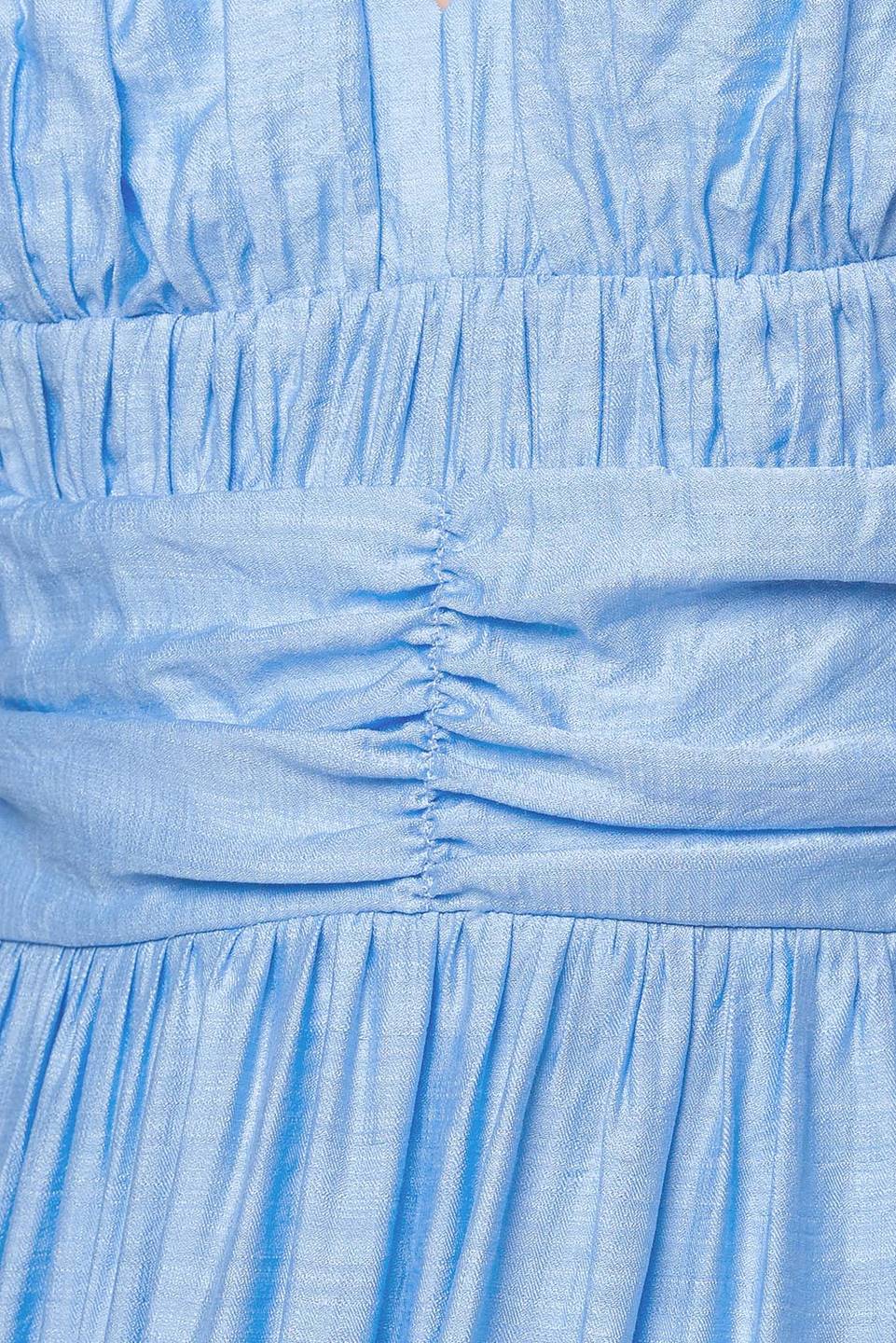 A light blue solid woven maxi dress featuring sweetheart neckline with straps, ruched bodice, tiered skirt and back zipper closure.