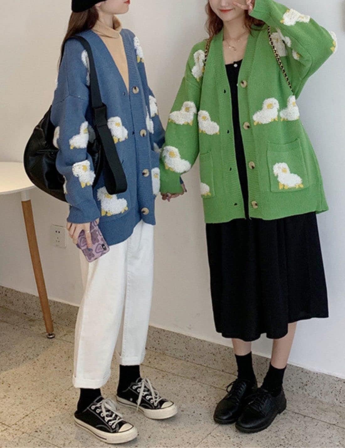 Unilexi Women's V Neck Button Long Sleeve Sweater Cartoon Sheep Cute Knitted Cardigan Coat with Pockets ‐ Green / Medium