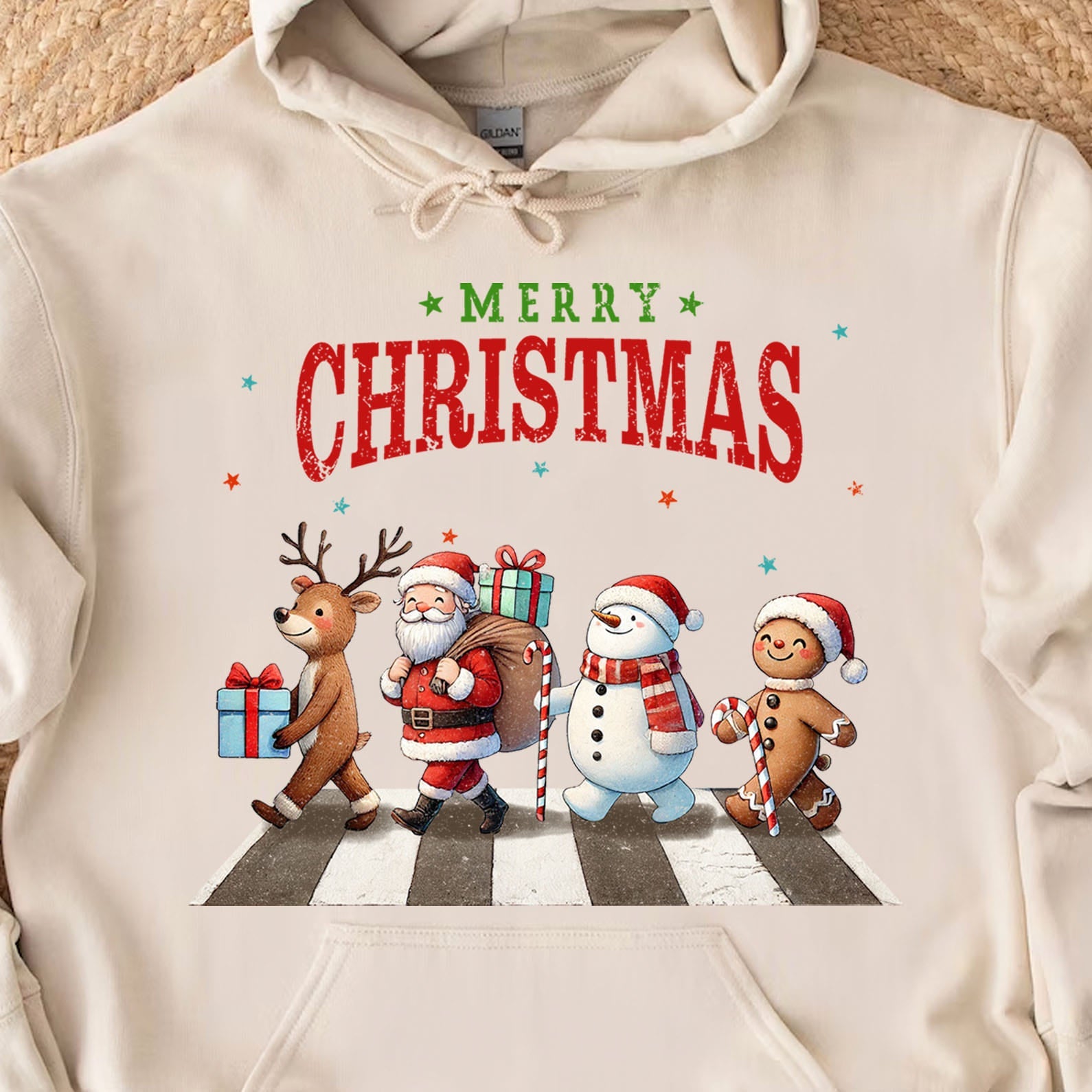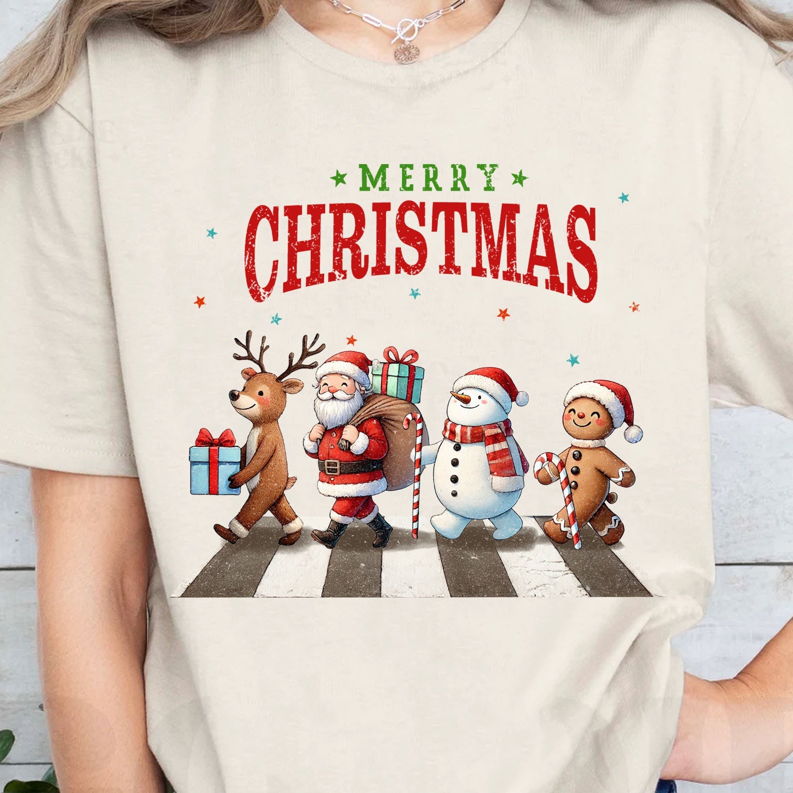 This festive t-shirt design combines four classic Christmas characters: Santa Claus, a reindeer, a snowman, and a gingerbread man happily crossing the street, evoking a playful and joyful holiday spirit. The characters are designed with cheerful expressions, bringing warmth and fun to the scene as they walk side by side, reminiscent of the iconic Abbey Road crossing. This charming and whimsical design is perfect for anyone who loves the holiday season and wants to showcase their Christmas spirit in a fun and lighthearted way!
