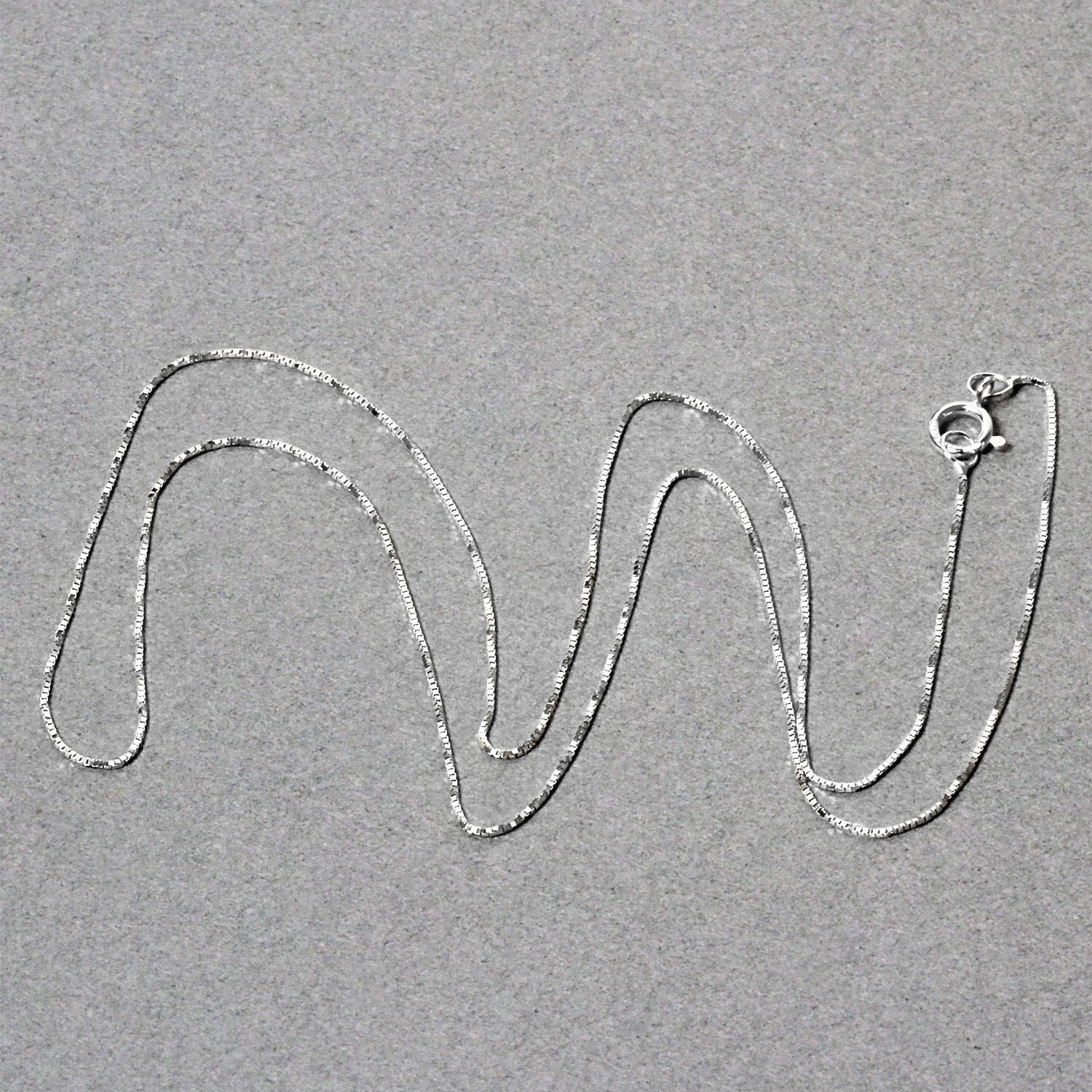 This classic box chain comes in 10k white gold and has a width of 0.45 millimeters.