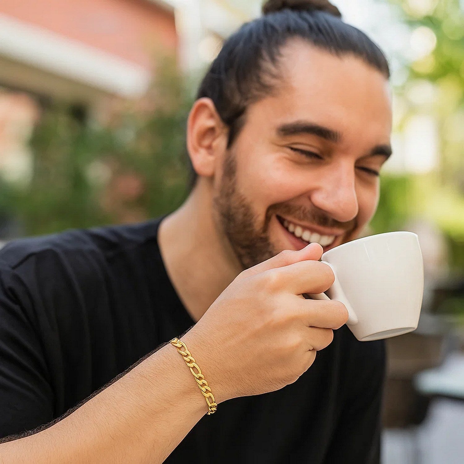 This link Figaro bracelet comes in 10k yellow gold and has a width of 5.3 millimeters. Secured with a lobster clasp.