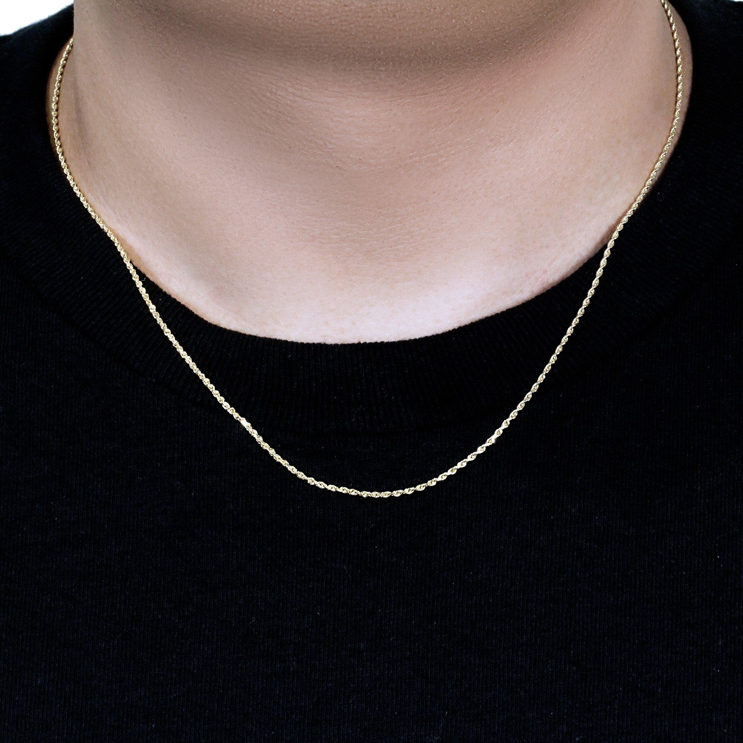 This solid diamond cut rope chain comes in 14k yellow gold and has a width of 1.4 millimeters.
