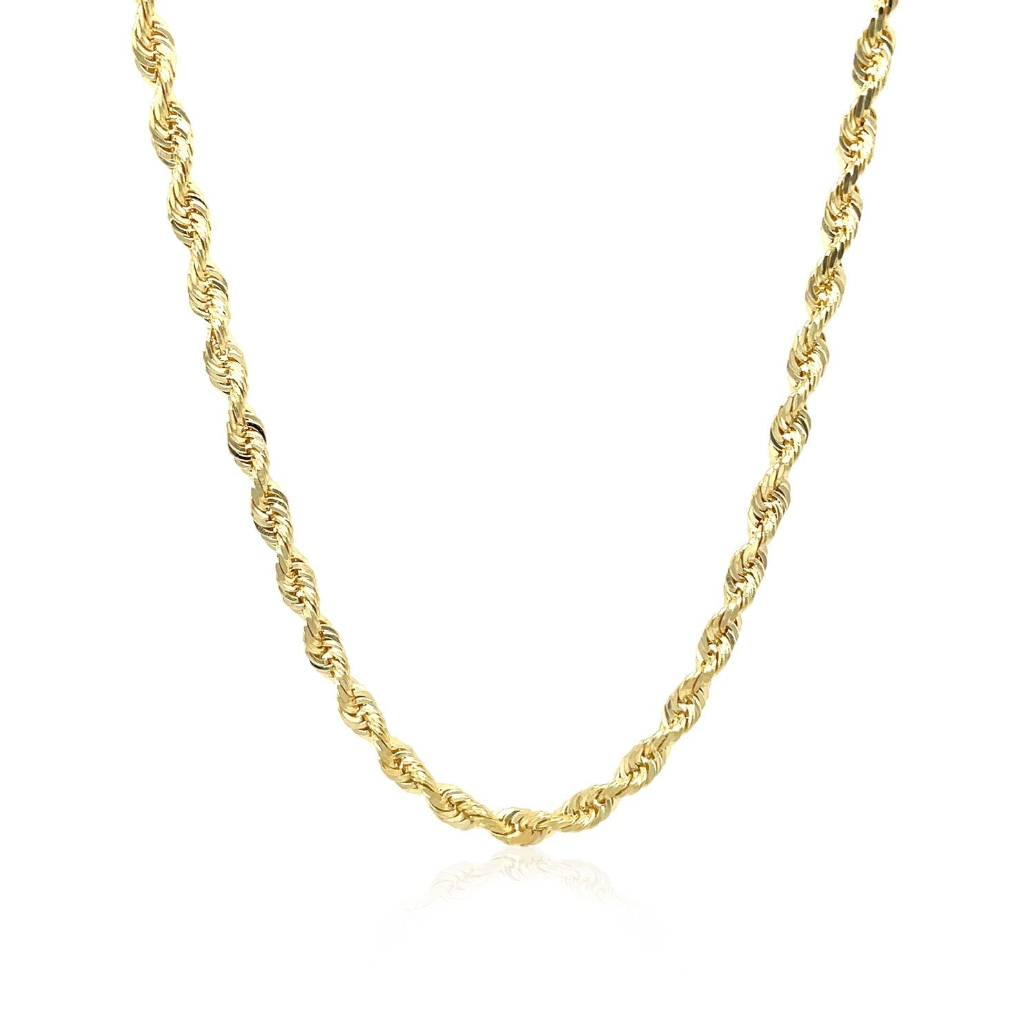 This solid diamond cut rope chain comes in 10k yellow gold and has a width of 3.0 millimeters.