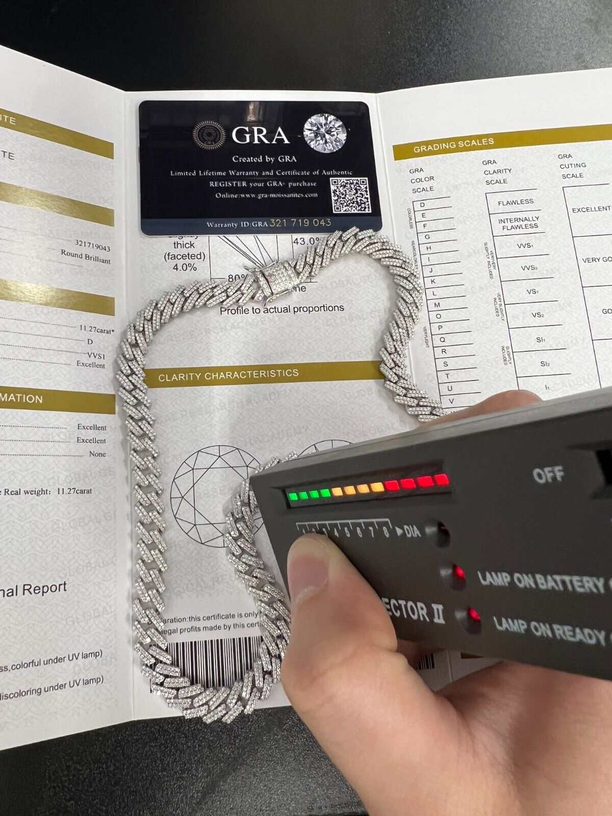 Men's or Ladies Miami Cuban Chain 11.27 carat (20 inch chain) and 13.23 carat (24 inch chain) moissanite stones passes diamond tester.
