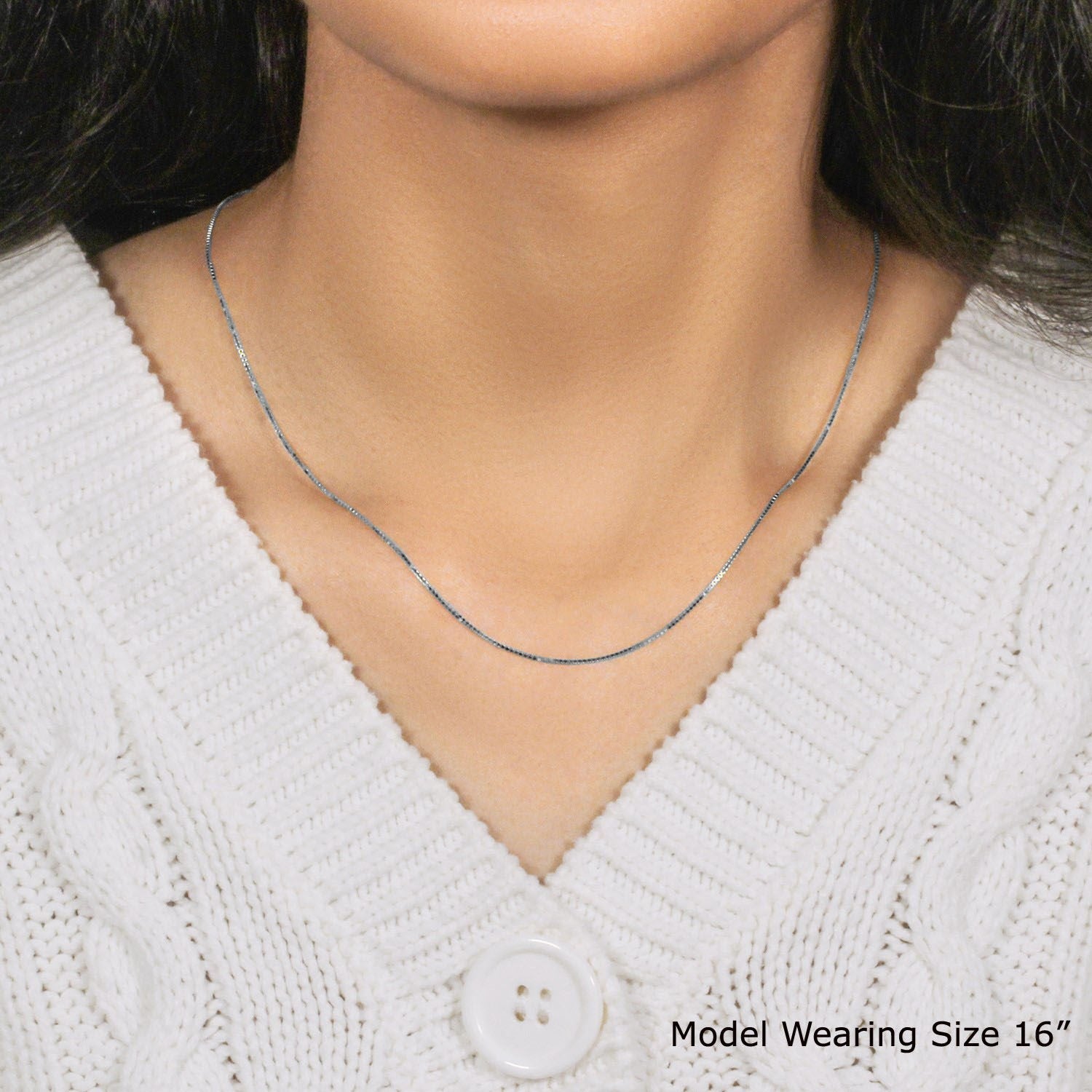 This classic box chain comes in 14k white gold and has a width of 0.68 millimeters.